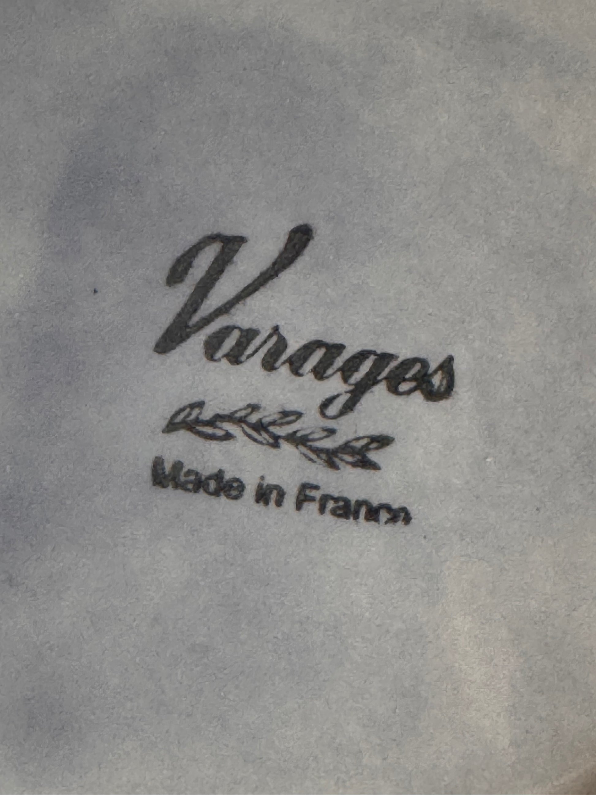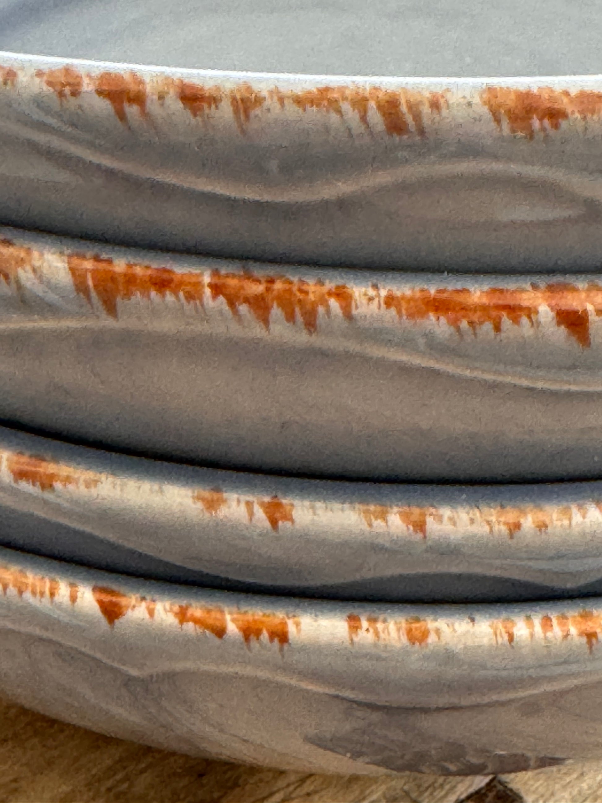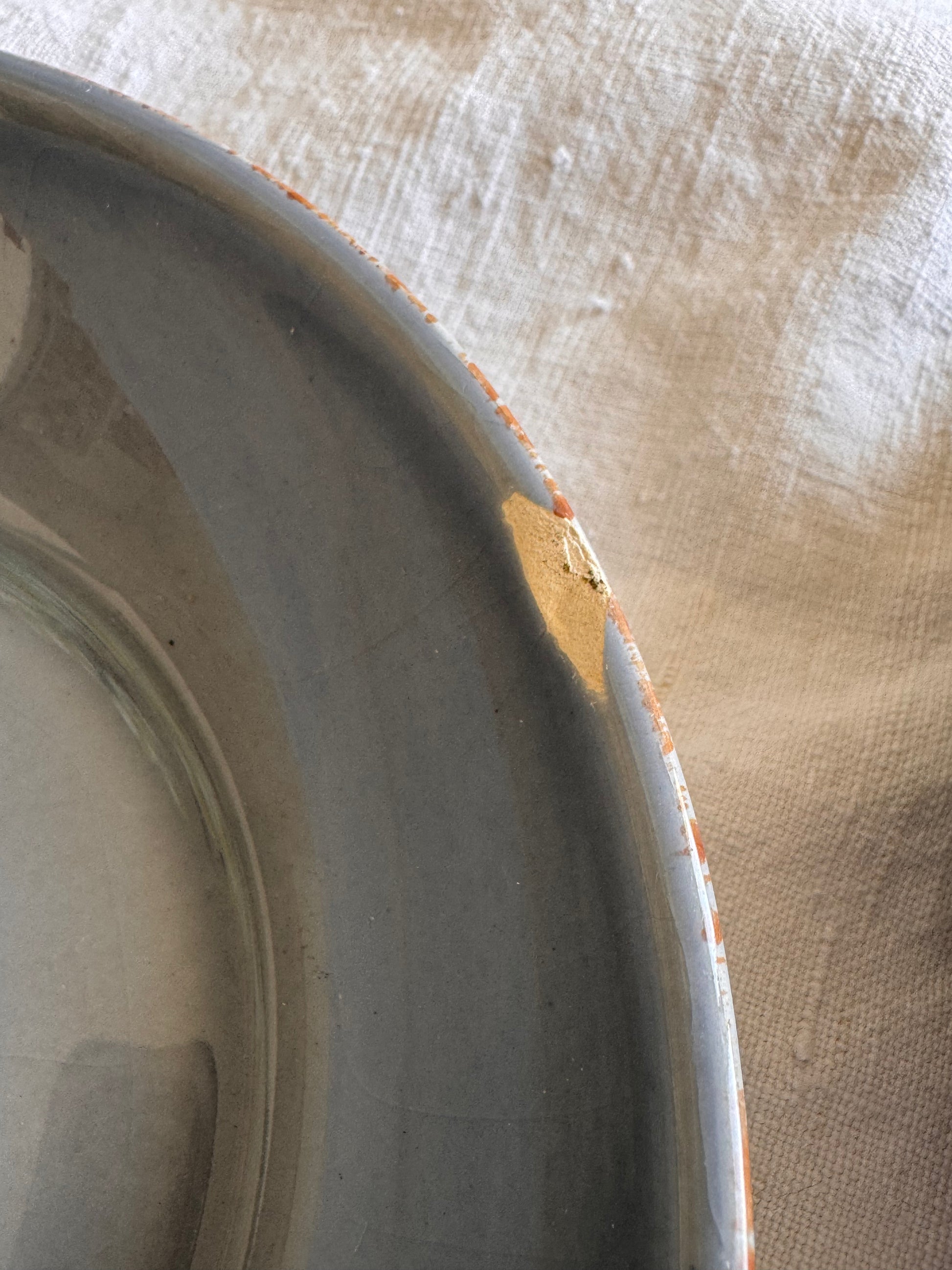 - Faiencerie de Varages (Provence). Couleur bleu orage. Bords légèrement irréguliers avec la terre cuite visible.