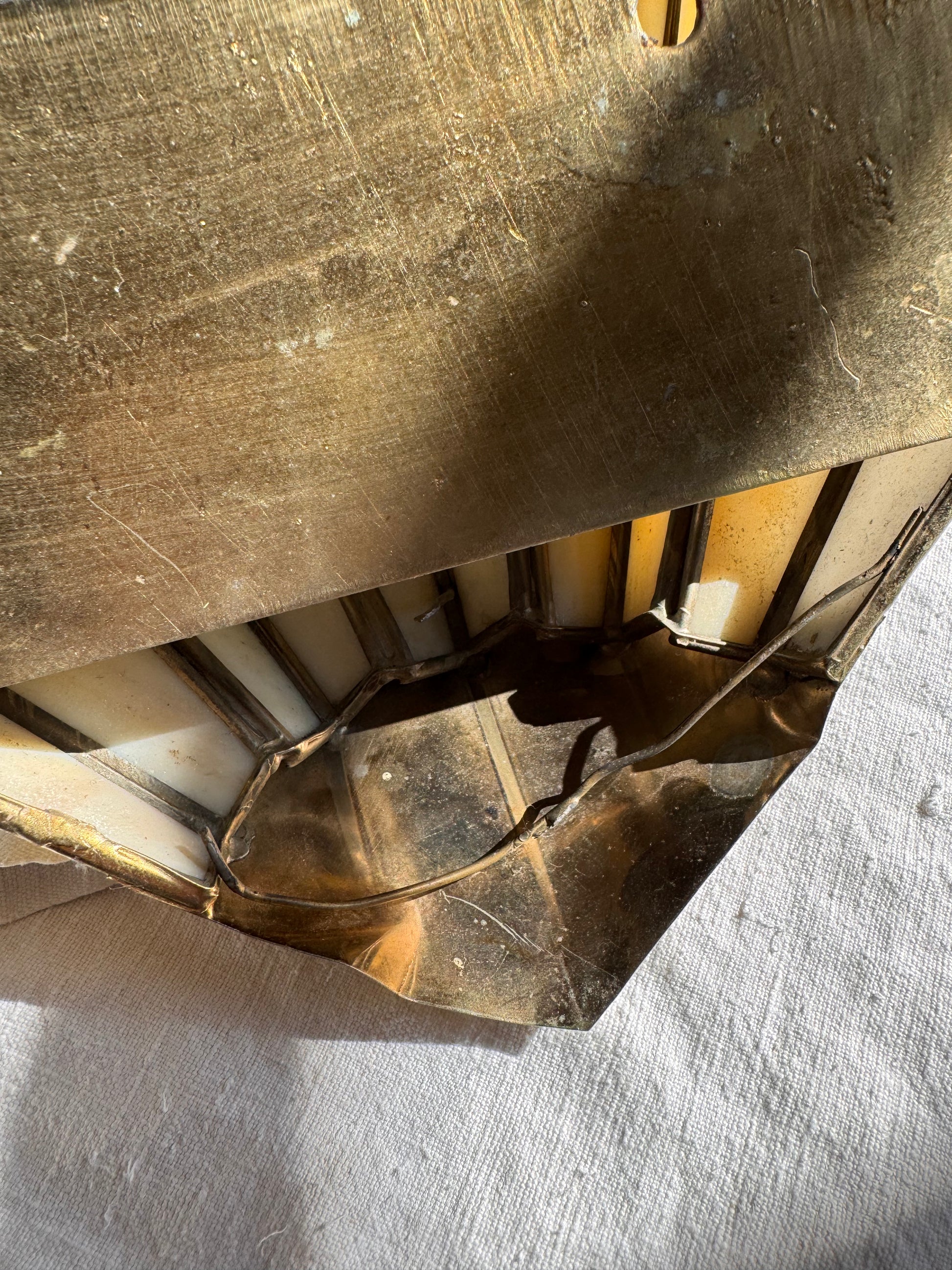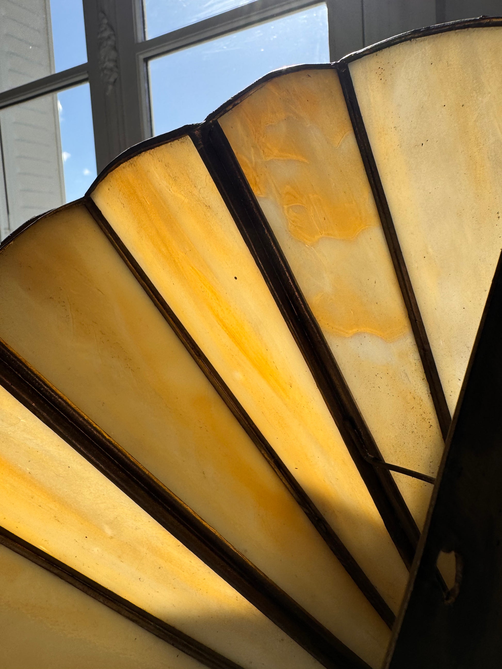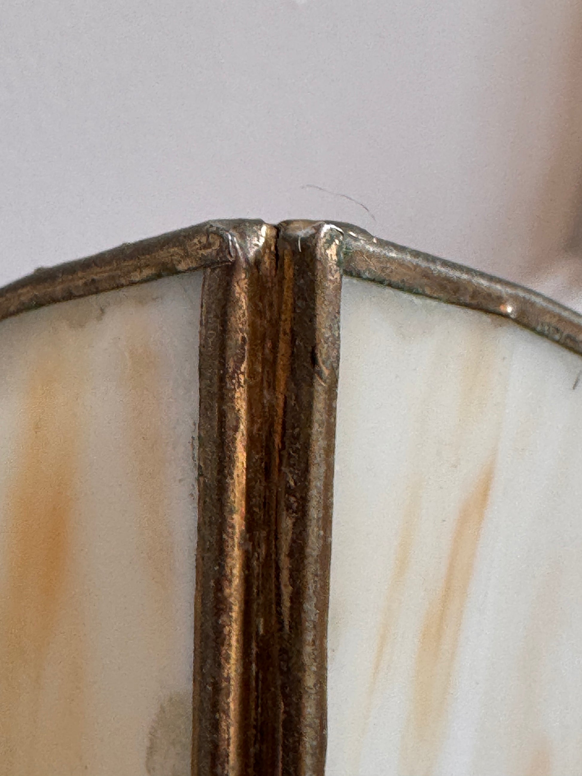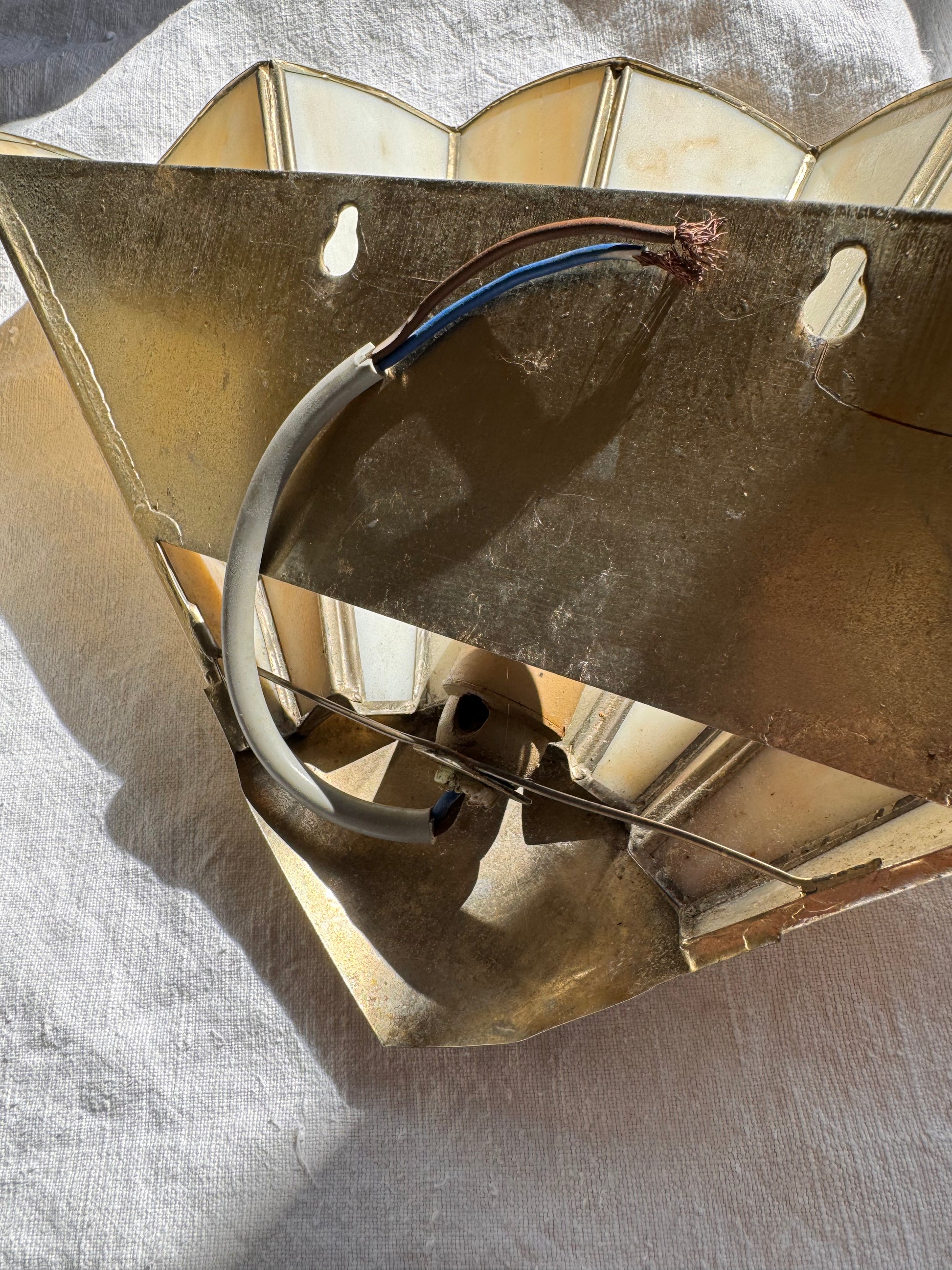 - Belle patine du temps. Parties éventails parfaites. Système d'électirfication à refaire pour l'une et à faire pour l'autre. Une des appliques présente une légère déformation à la base qui peut être redressée par un professionnel.