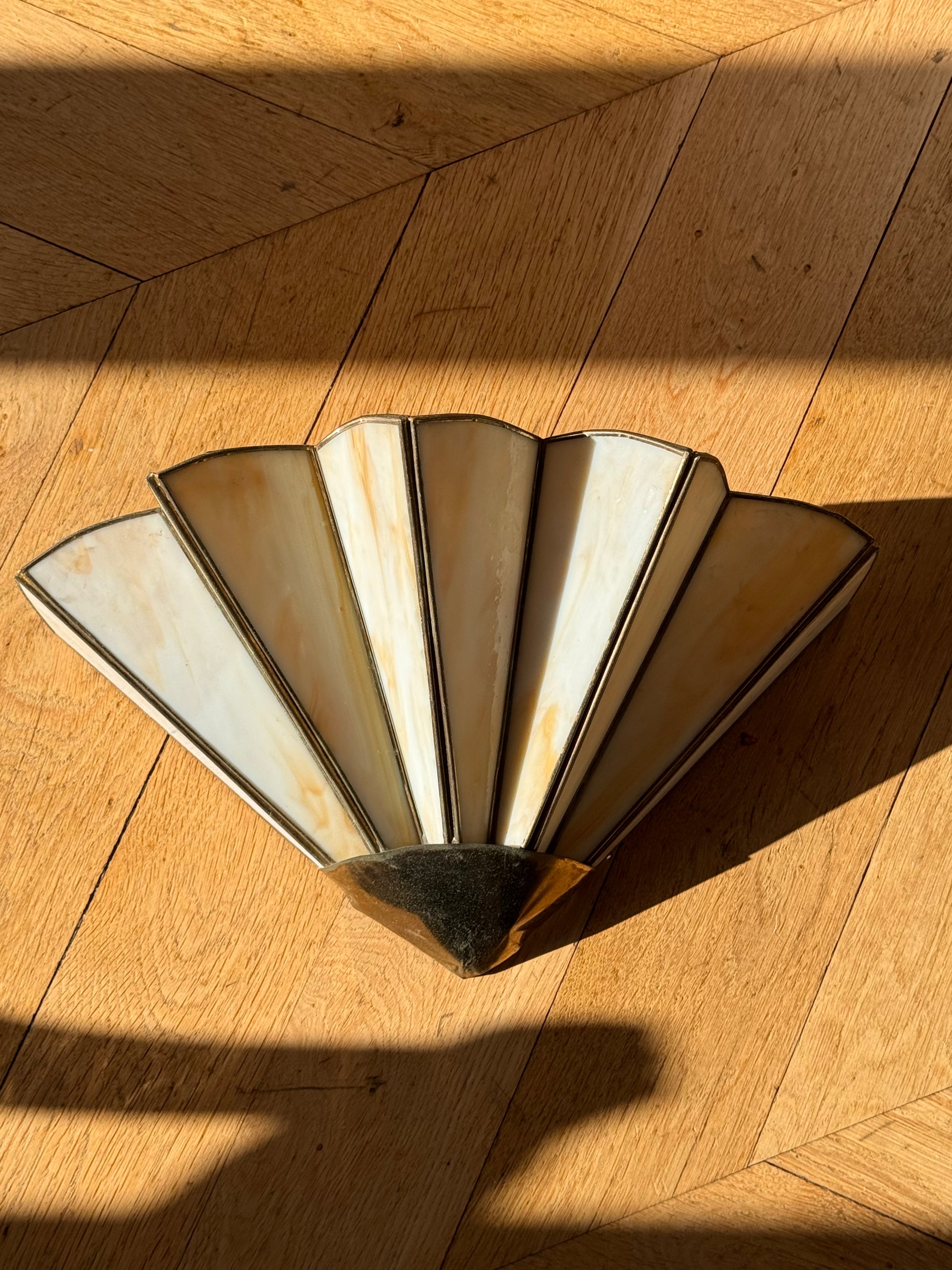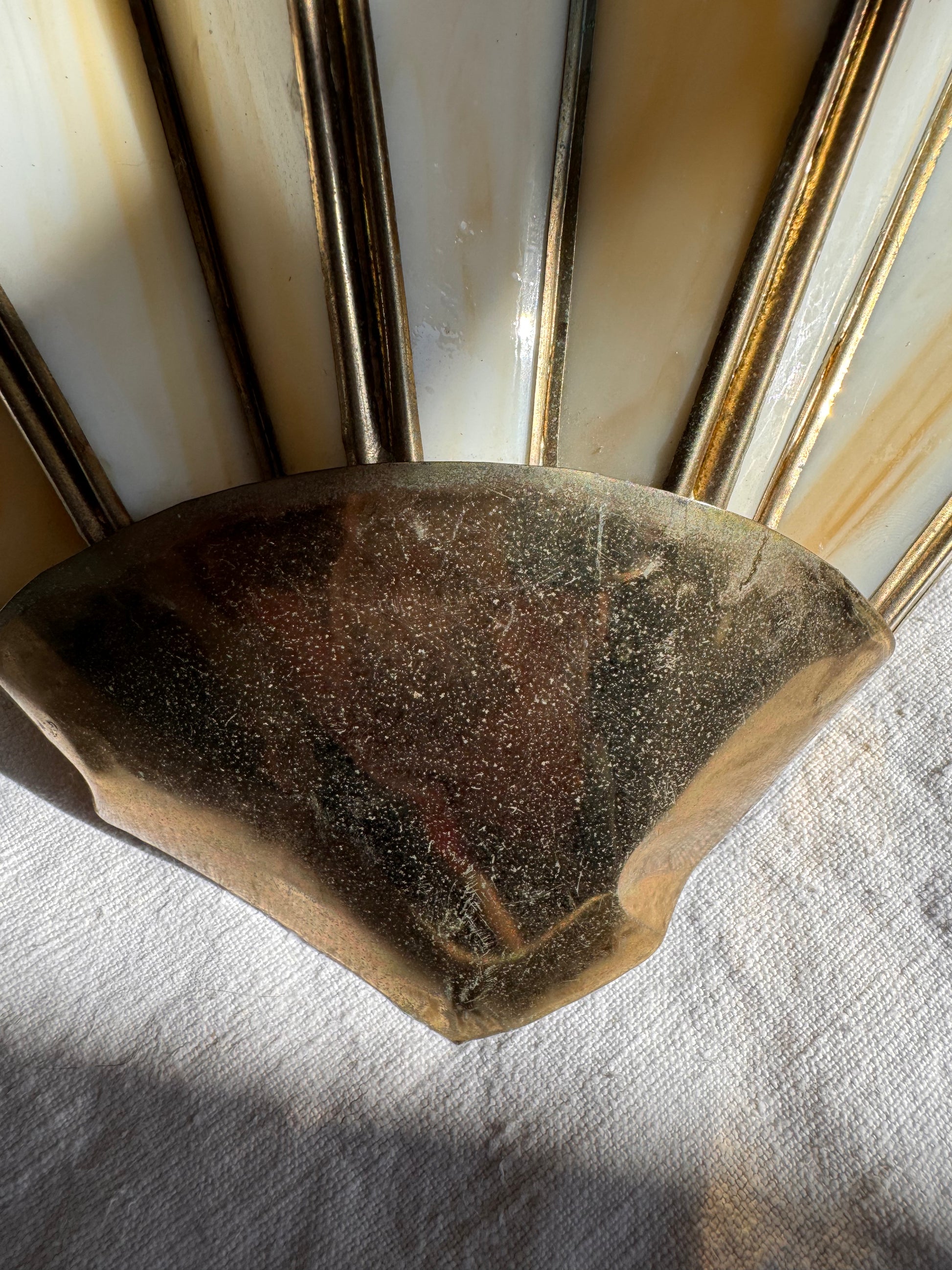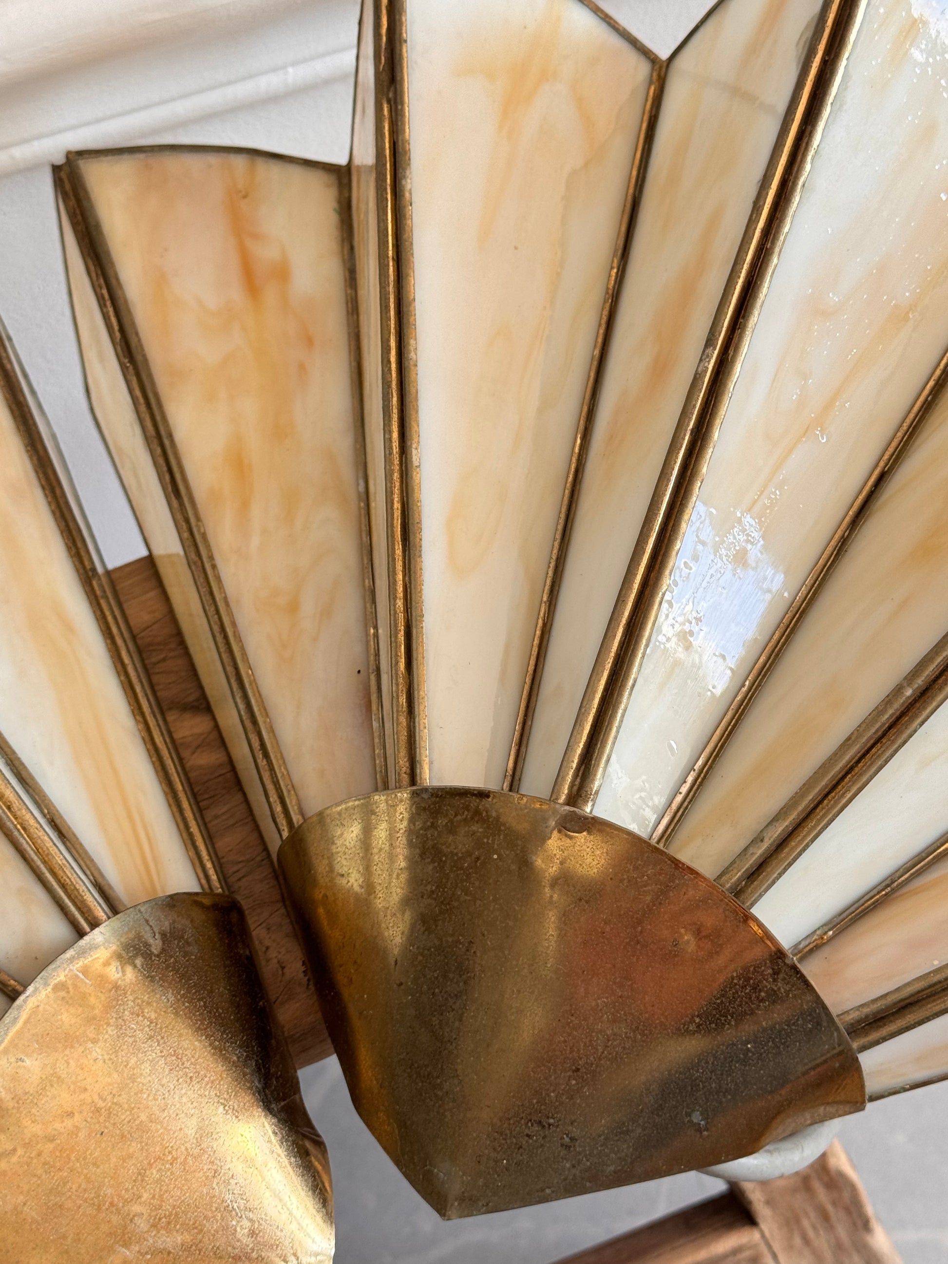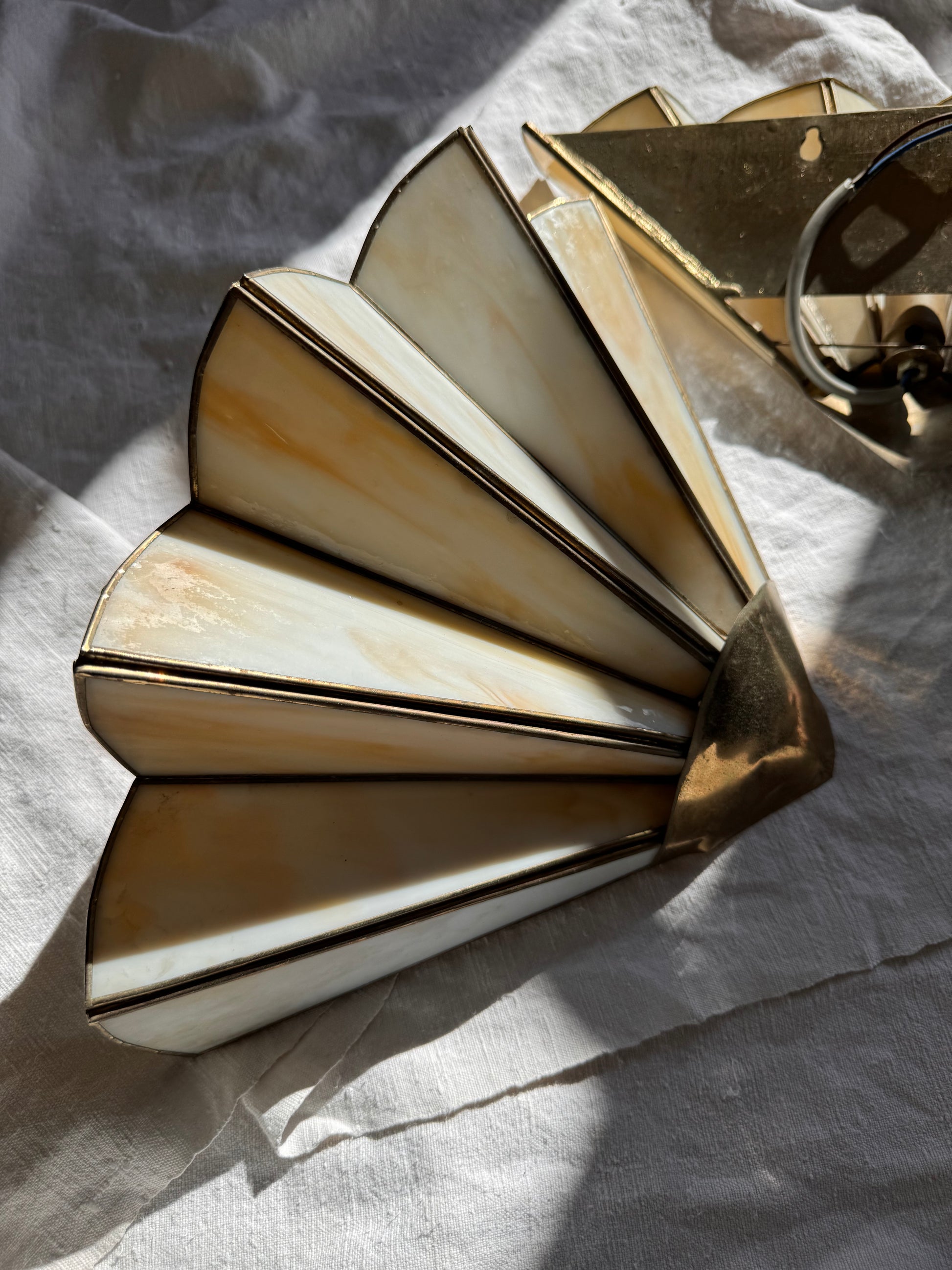 Cette paire d'appliques très décorative est composée de panneaux en verre marbré sertis dans une structure en laiton à la forme d'éventail. Allumées, elles révèlent les subtiles variations entre le crème et le miel. Les lignes géométriques et sculpturales évoquent les intérieurs parisiens des années 1930.