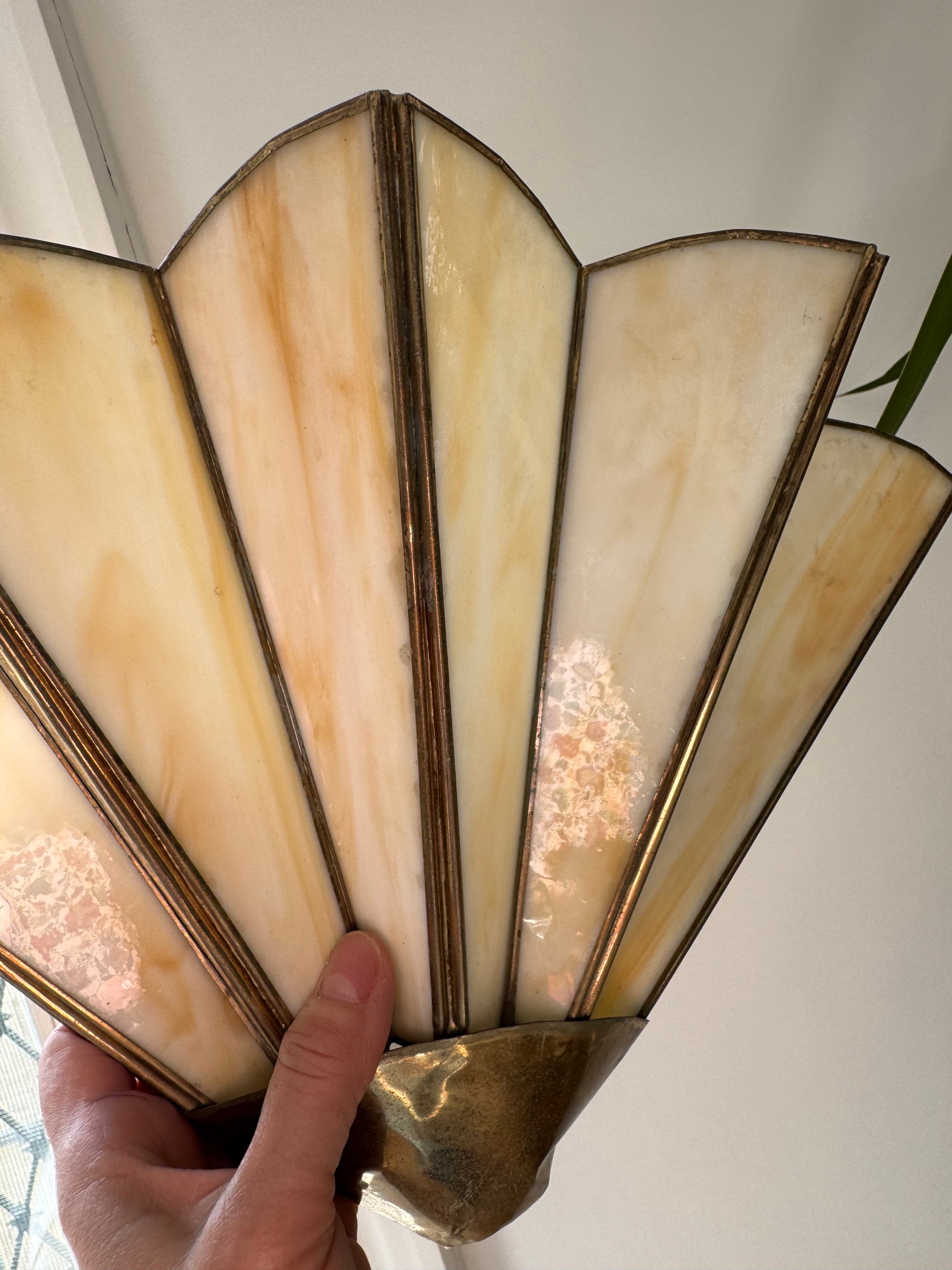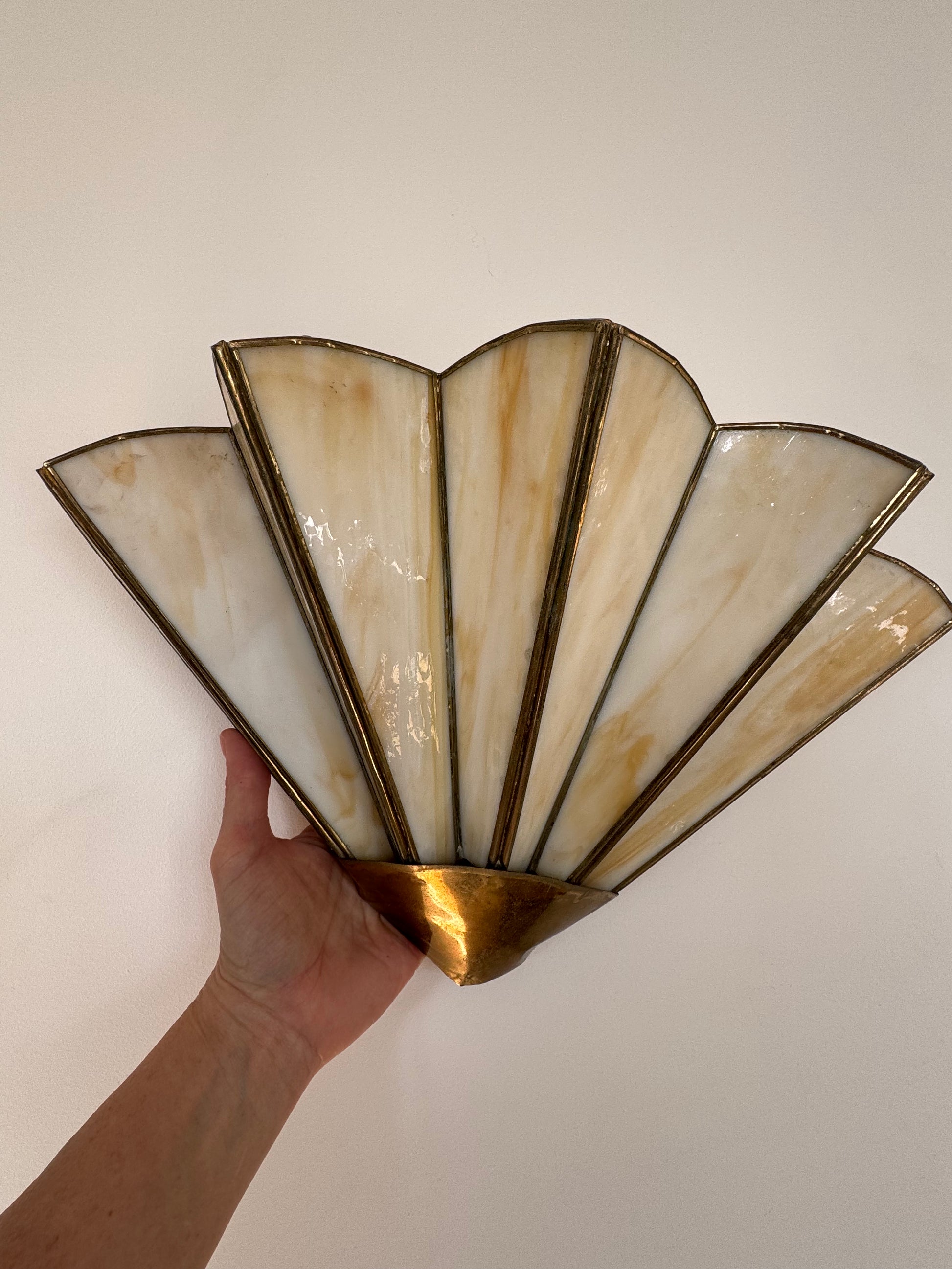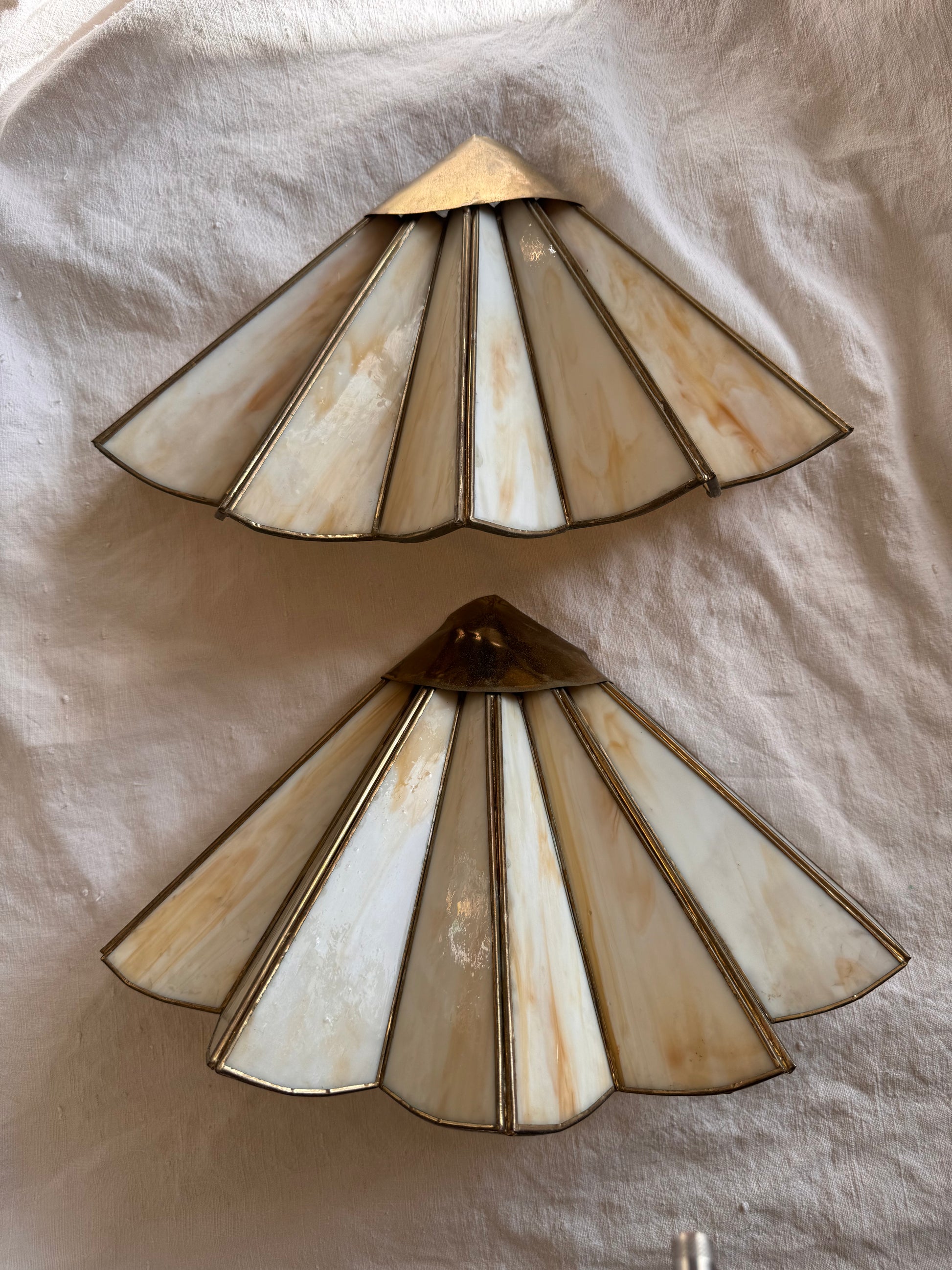Cette paire d'appliques très décorative est composée de panneaux en verre marbré sertis dans une structure en laiton à la forme d'éventail. Allumées, elles révèlent les subtiles variations entre le crème et le miel. Les lignes géométriques et sculpturales évoquent les intérieurs parisiens des années 1930.