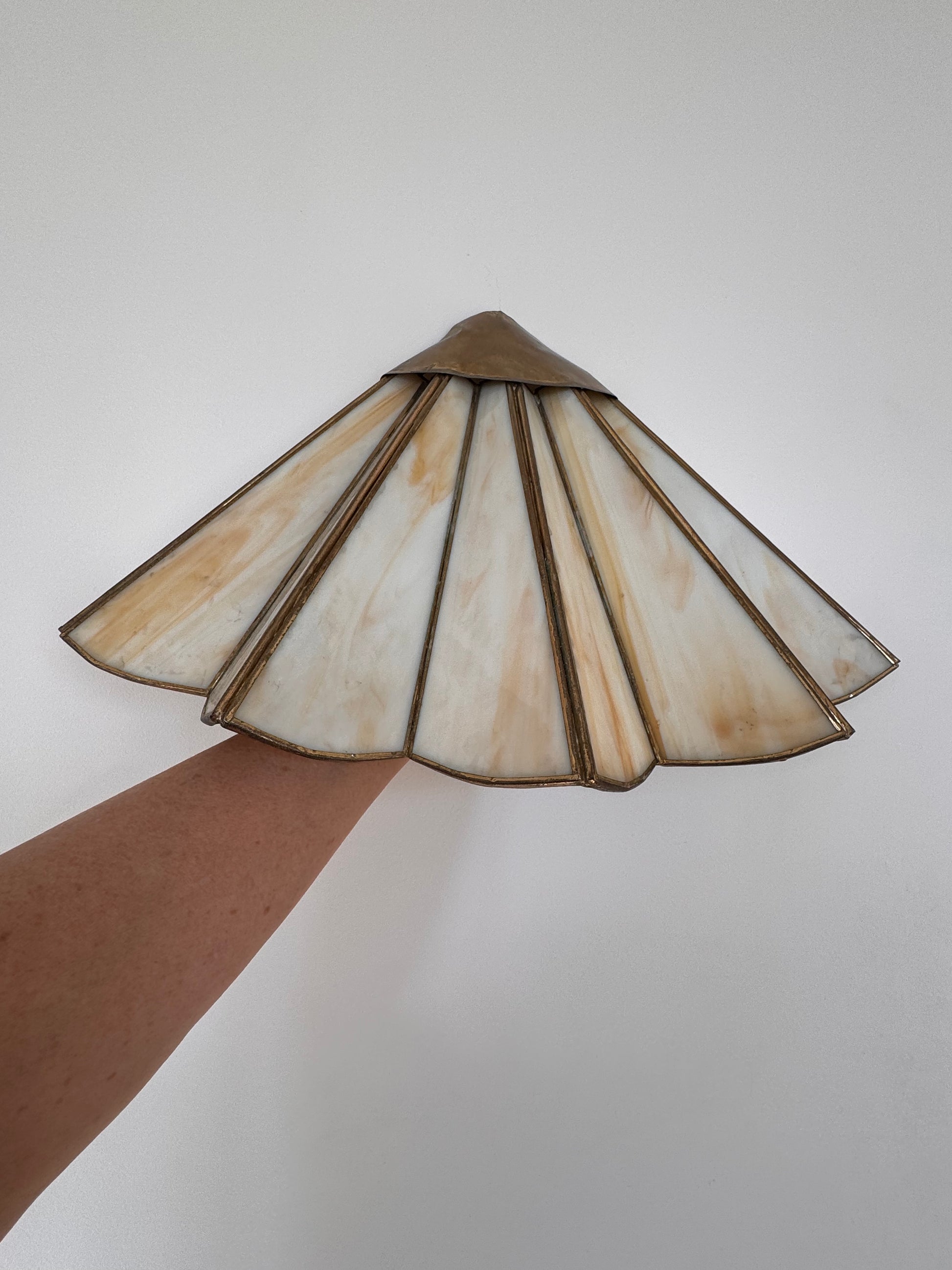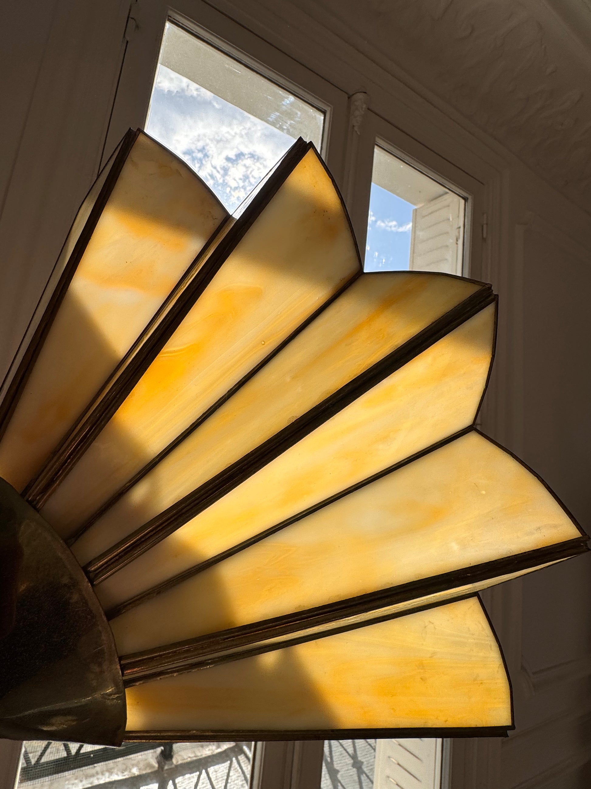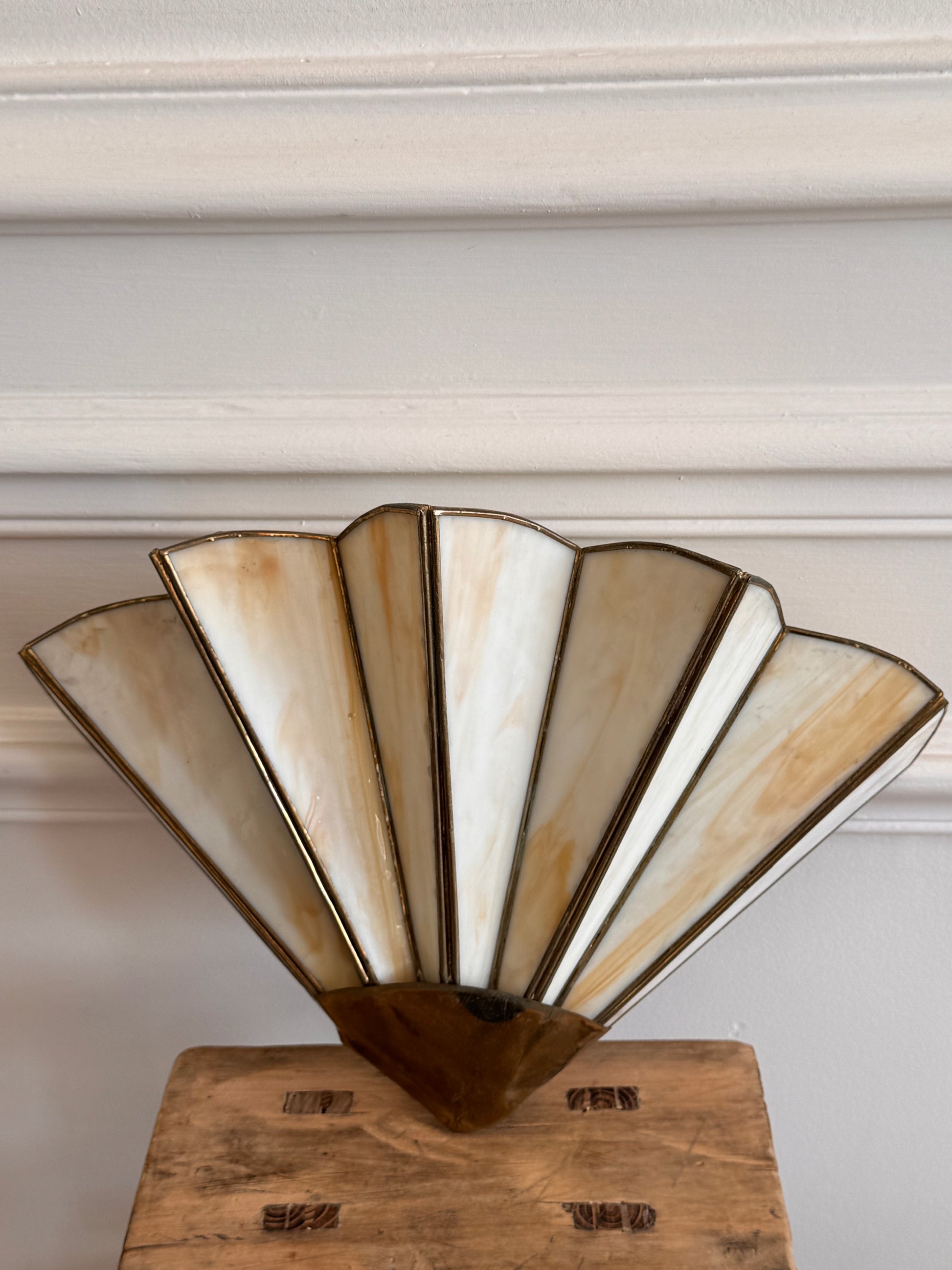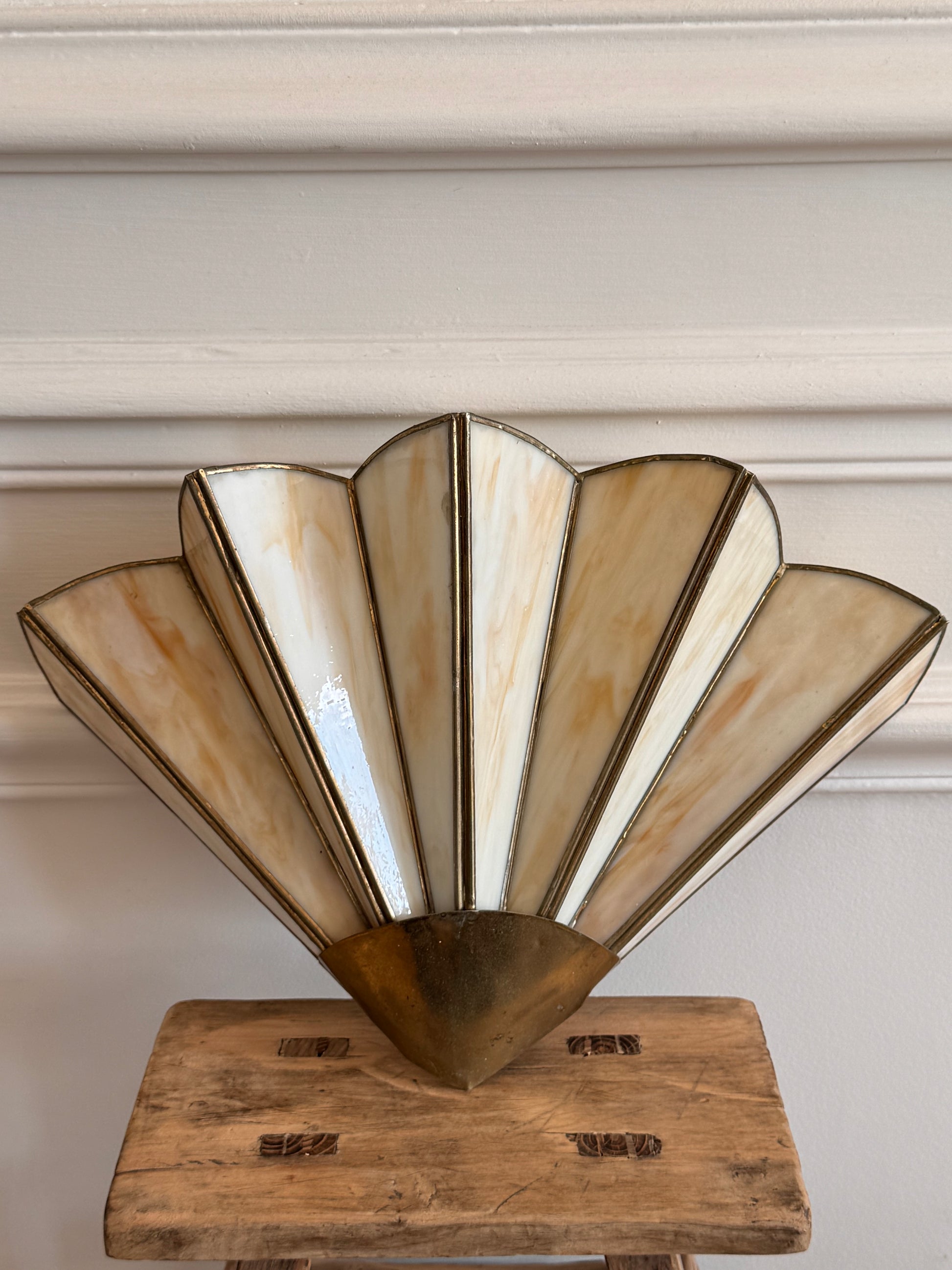 Cette paire d'appliques très décorative est composée de panneaux en verre marbré sertis dans une structure en laiton à la forme d'éventail. Allumées, elles révèlent les subtiles variations entre le crème et le miel. Les lignes géométriques et sculpturales évoquent les intérieurs parisiens des années 1930.