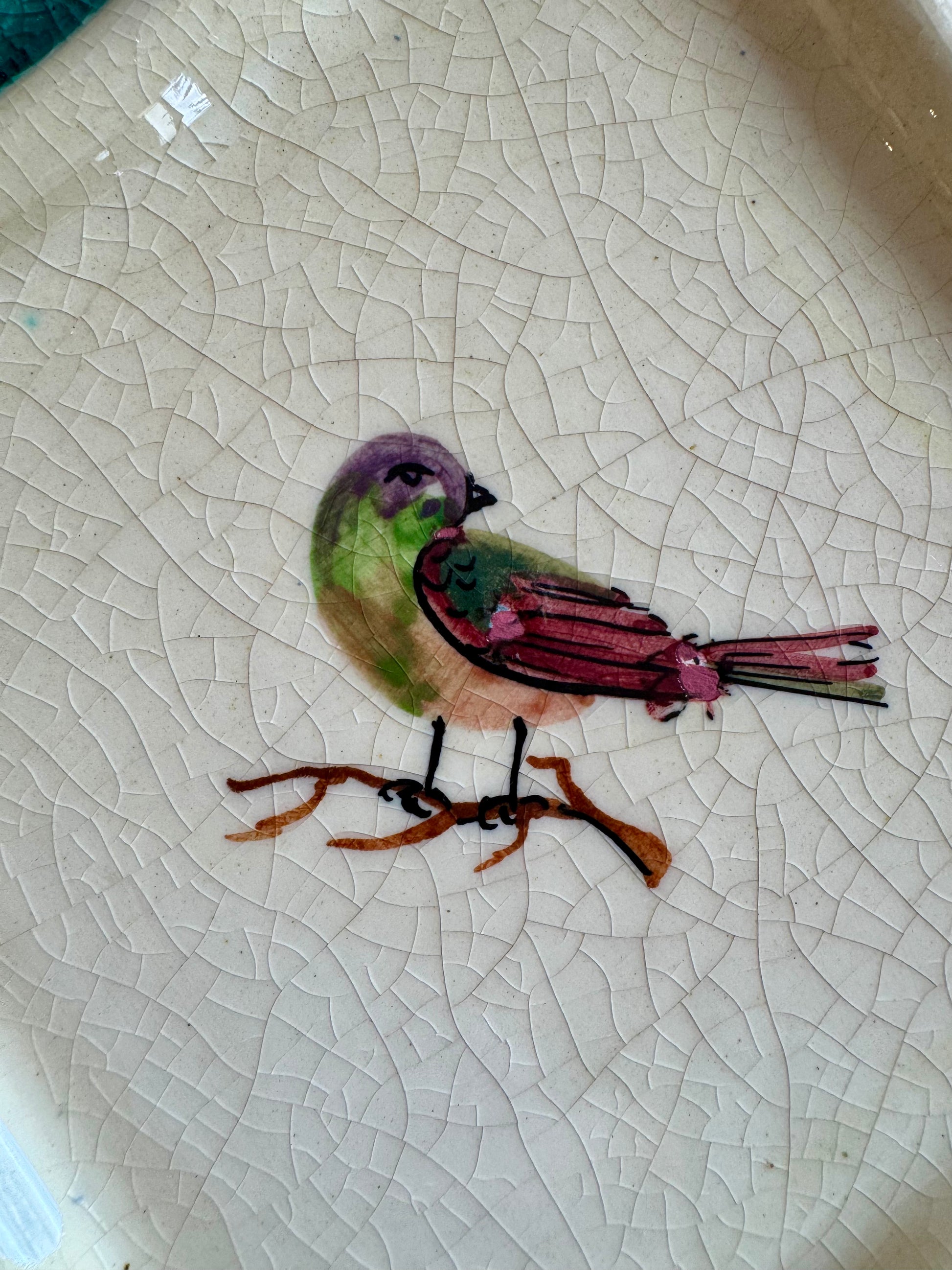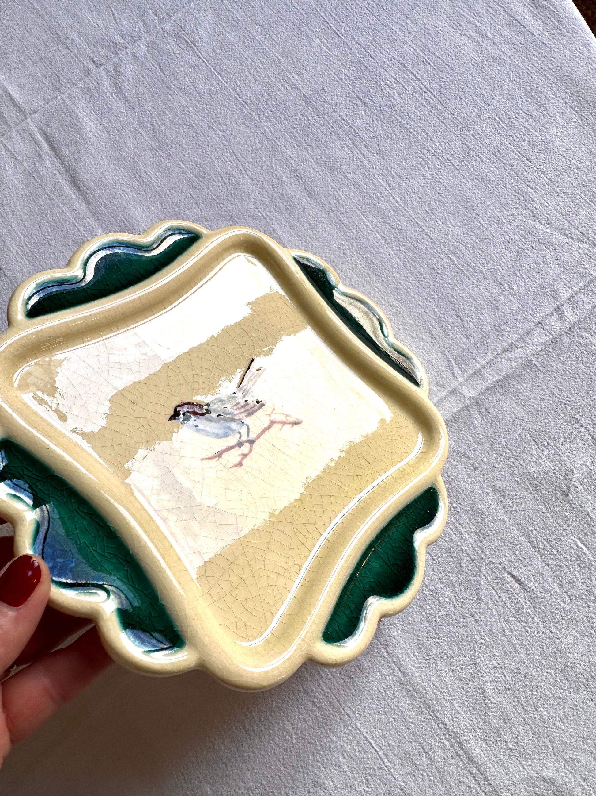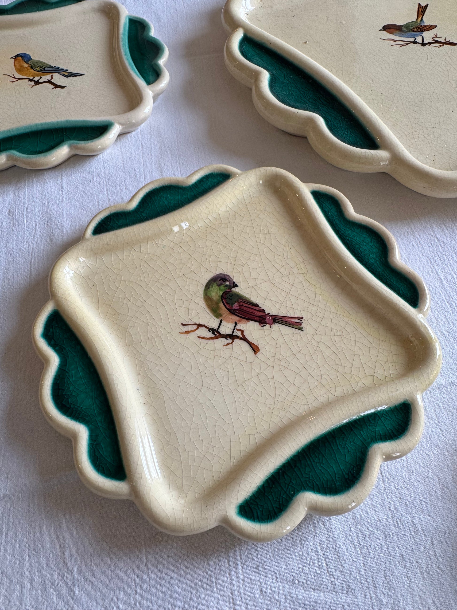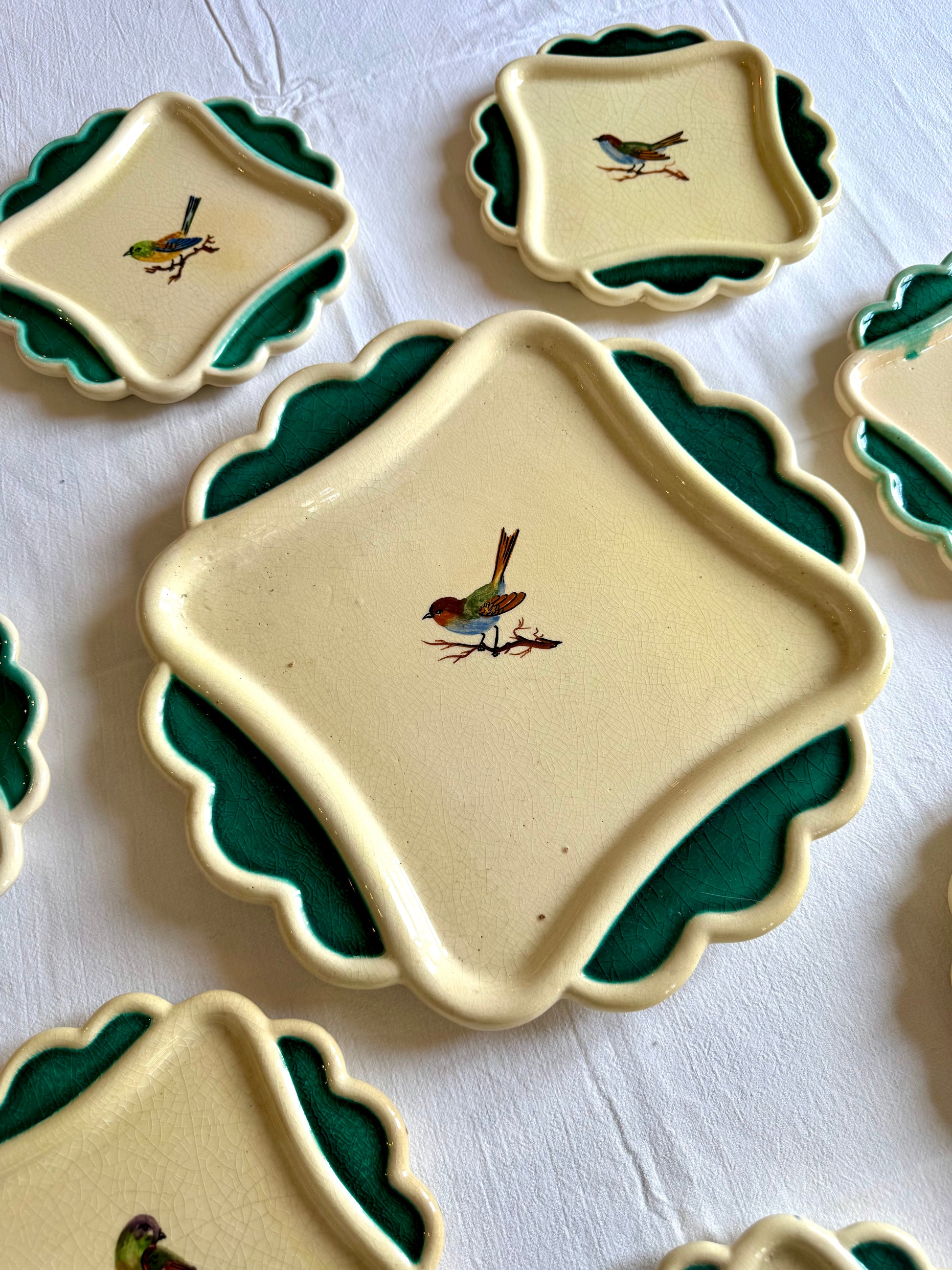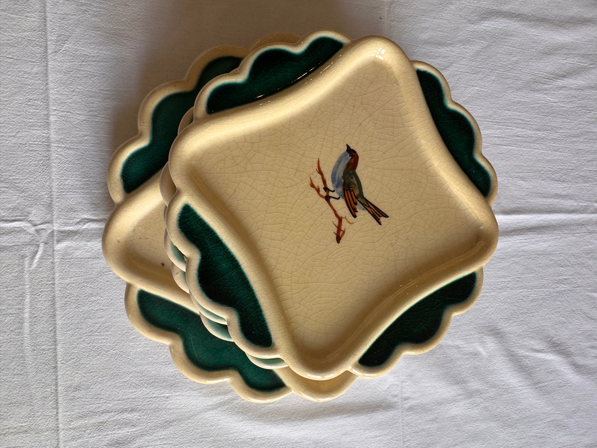 Service à dessert très original des années 50 composé d'un grand plat et de sept assiettes en céramique émaillée polychrome à décor d’oiseaux branchés et à bordures polylobées. Vallauris. Ray Camart. Peut également servir de service à fromage.