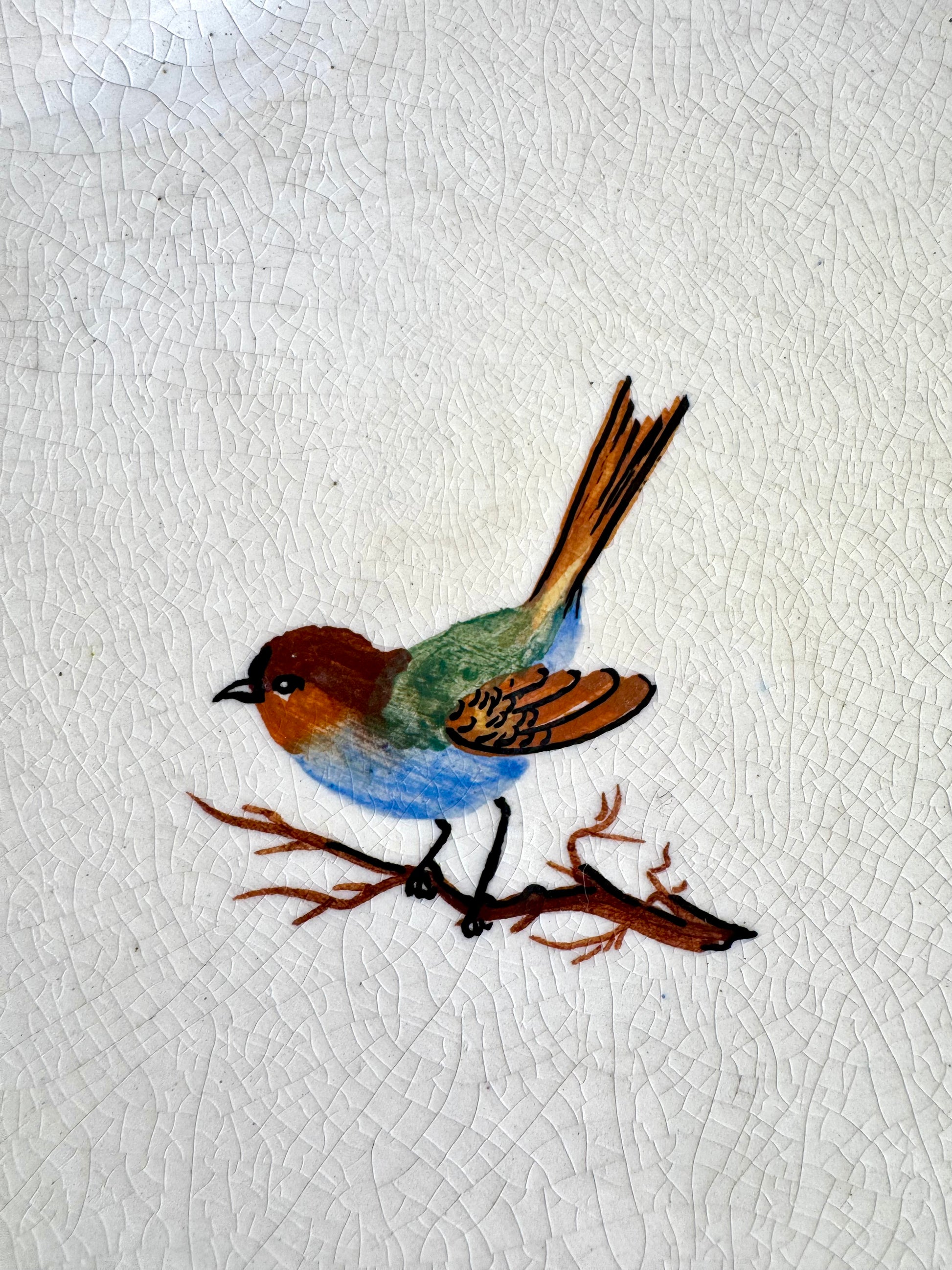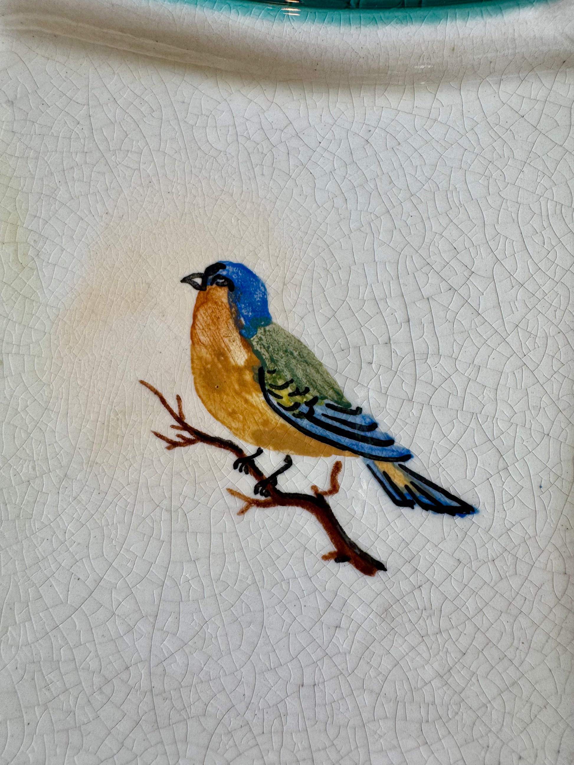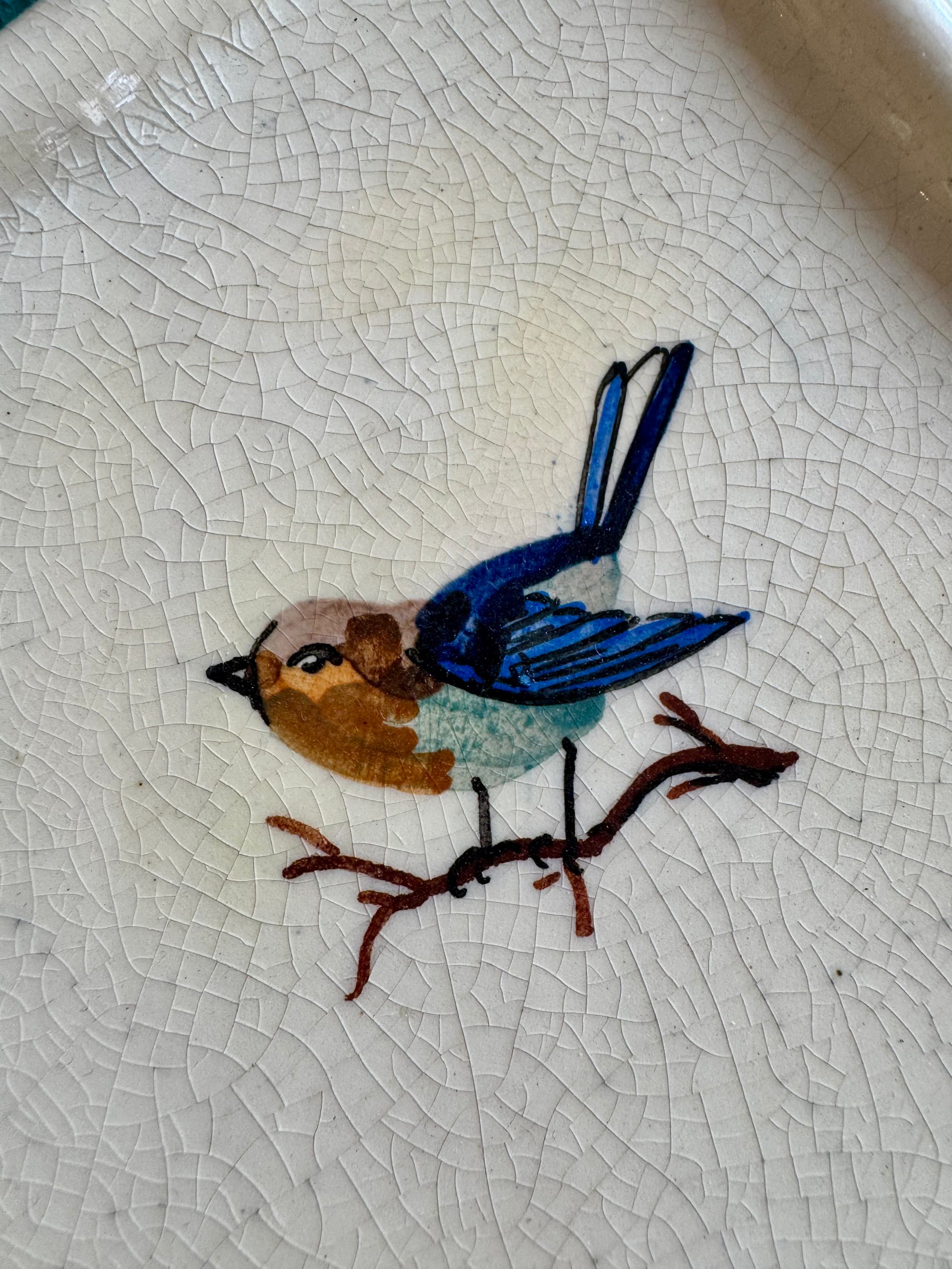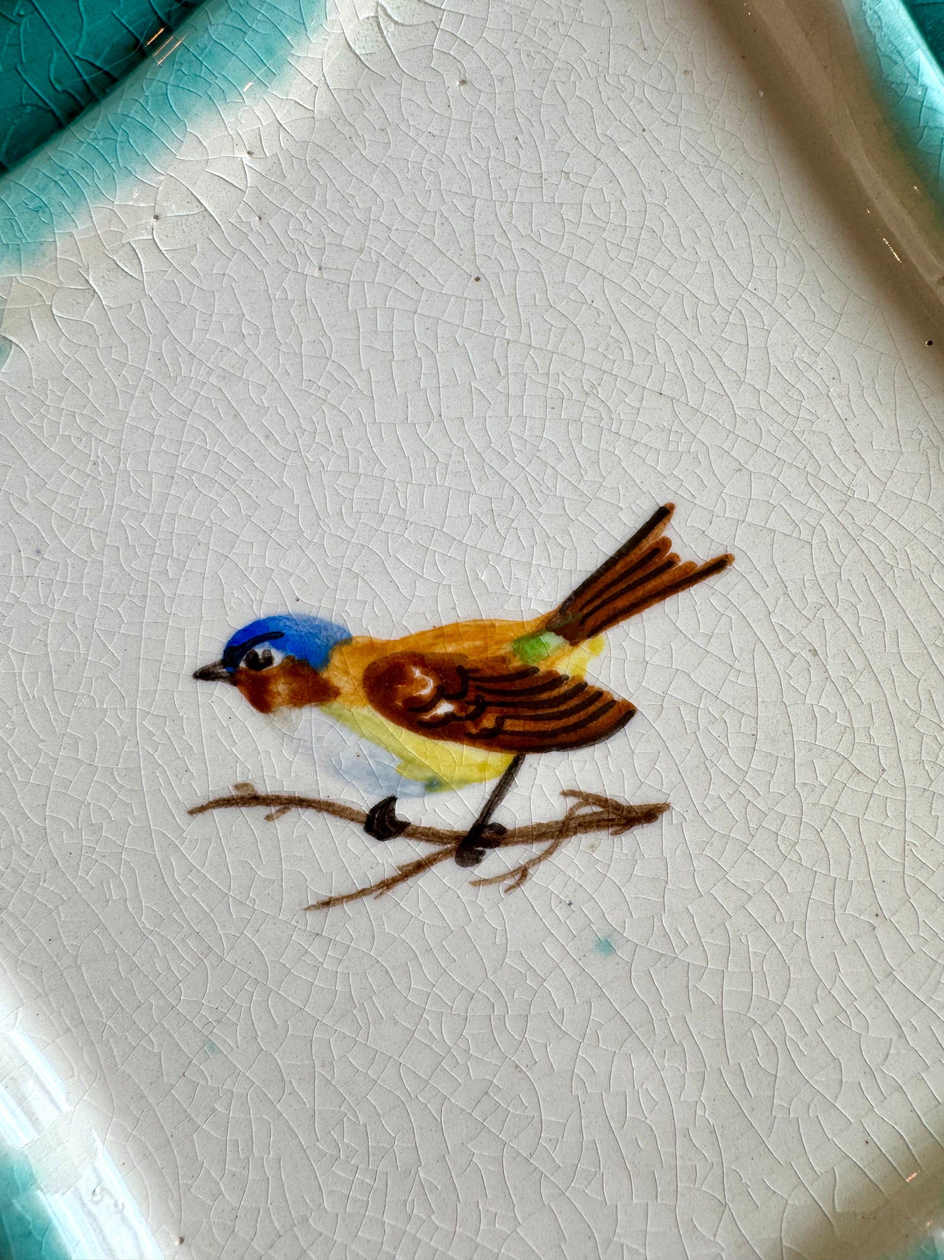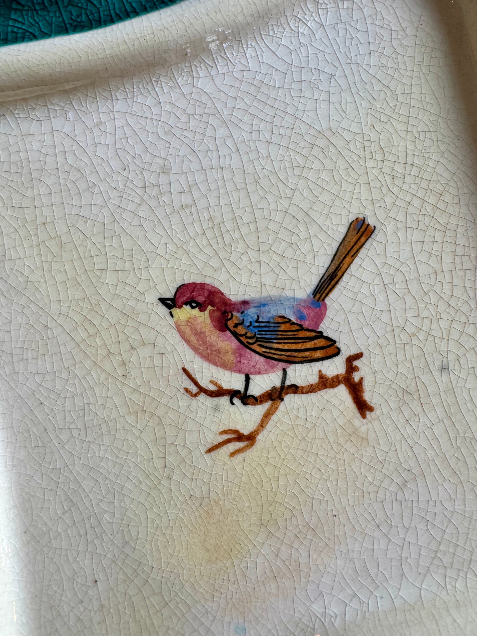 Service à dessert très original des années 50 composé d'un grand plat et de sept assiettes en céramique émaillée polychrome à décor d’oiseaux branchés et à bordures polylobées. Vallauris. Ray Camart. Peut également servir de service à fromage.