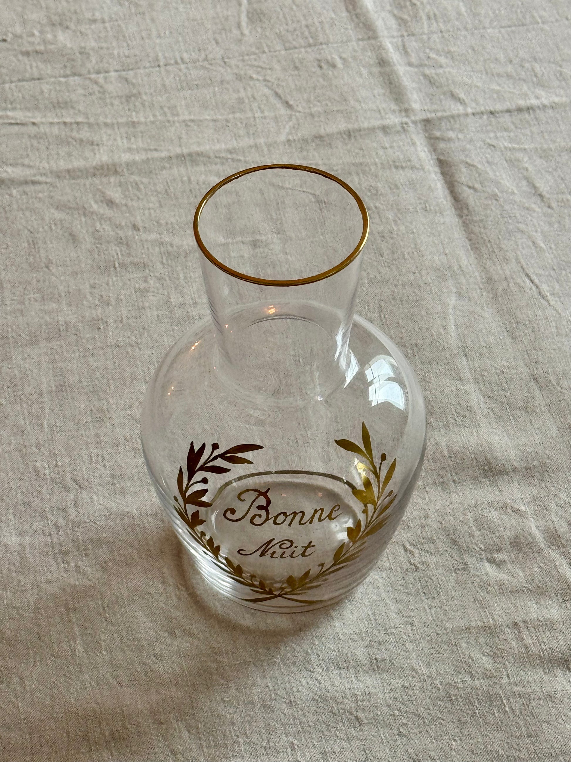 - Une carafe en cristal avec une inscription "Bonne Nuit", deux liserés et deux guirlandes de laurier dorés.
