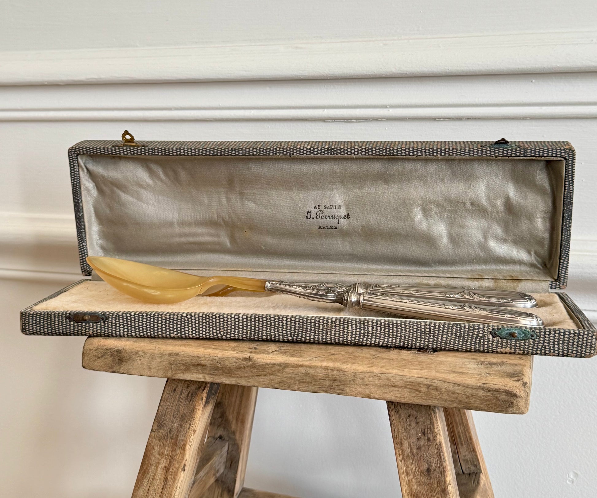 - Très bon état. Petit manque à la base d'une des dents de la fourchette. Traces et marques dues au temps à leur l’utilisation. Lavage à la main uniquement. Livrés avec leur coffret qui n'est pas tout neuf "Au Saphir - J. Perruquet à Arles".
