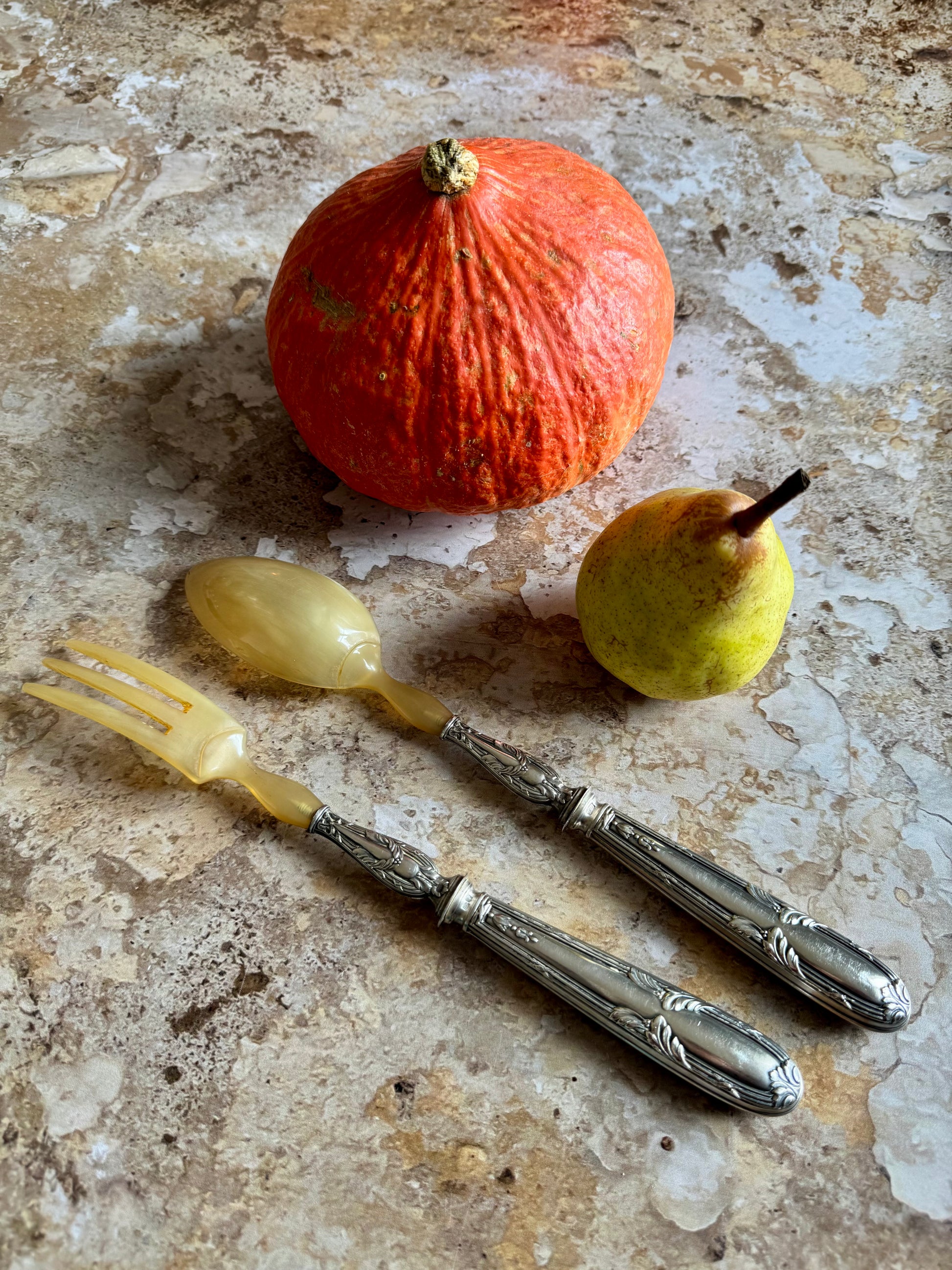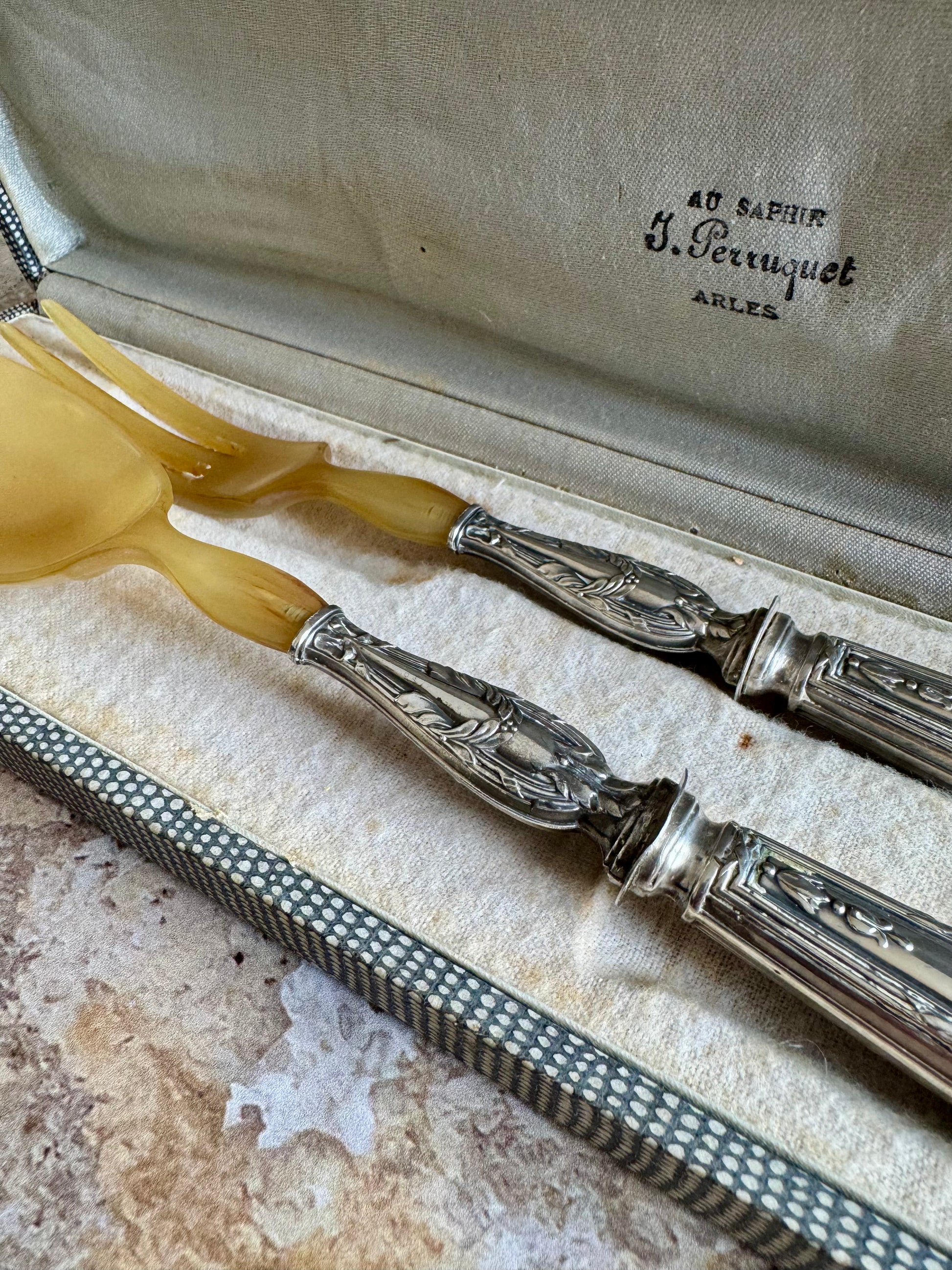 Ces anciens couverts à salade possèdent des manches délicatement ciselés en argent fourré : argent massif creux rempli d'un autre matériau pour l'alléger. N'attendez pas les belles occasions pour vous en servir : utilisez-les quotidiennement pour embellir votre quotidien. C'est également une belle idée de cadeaux de mariage.