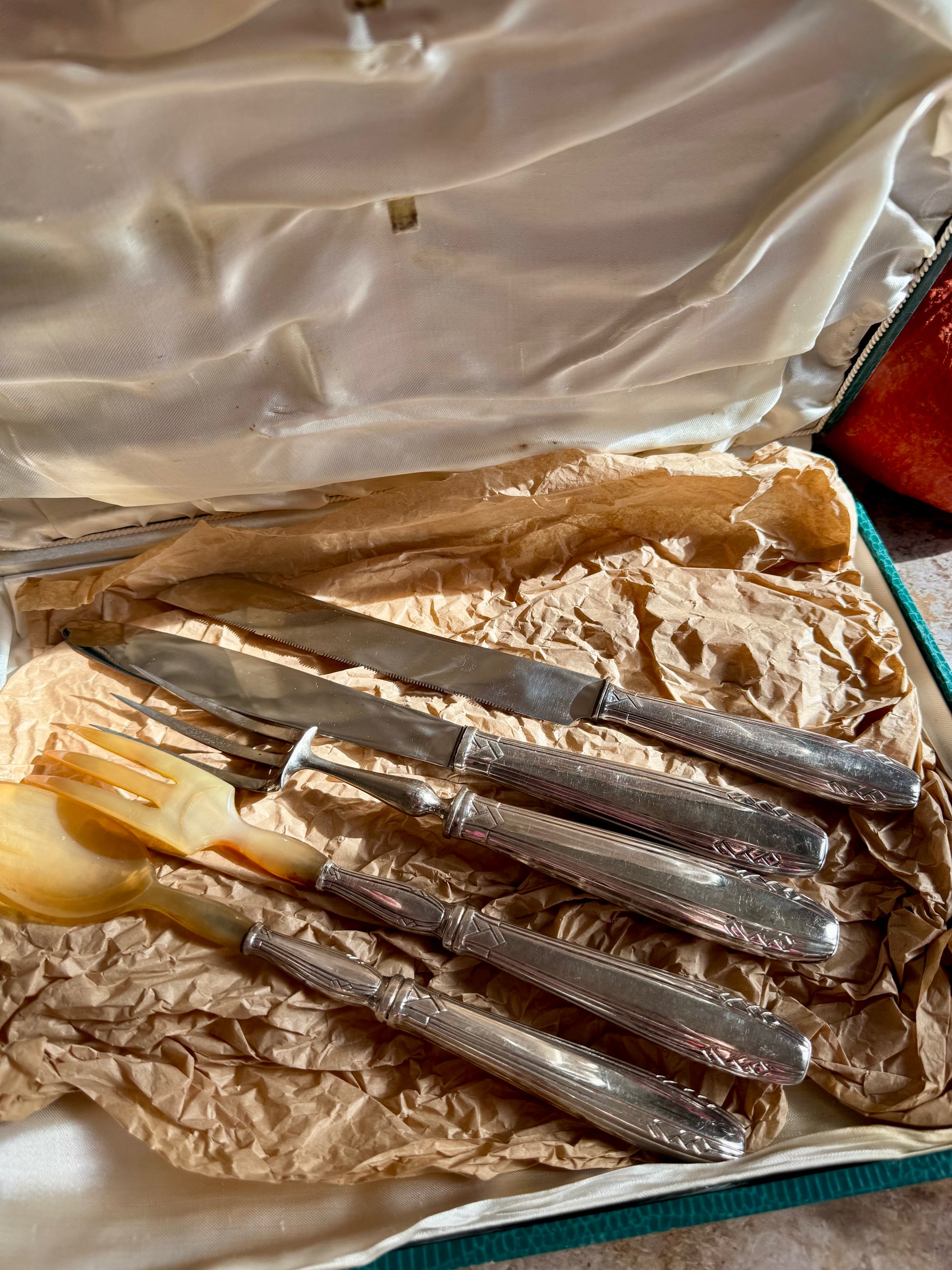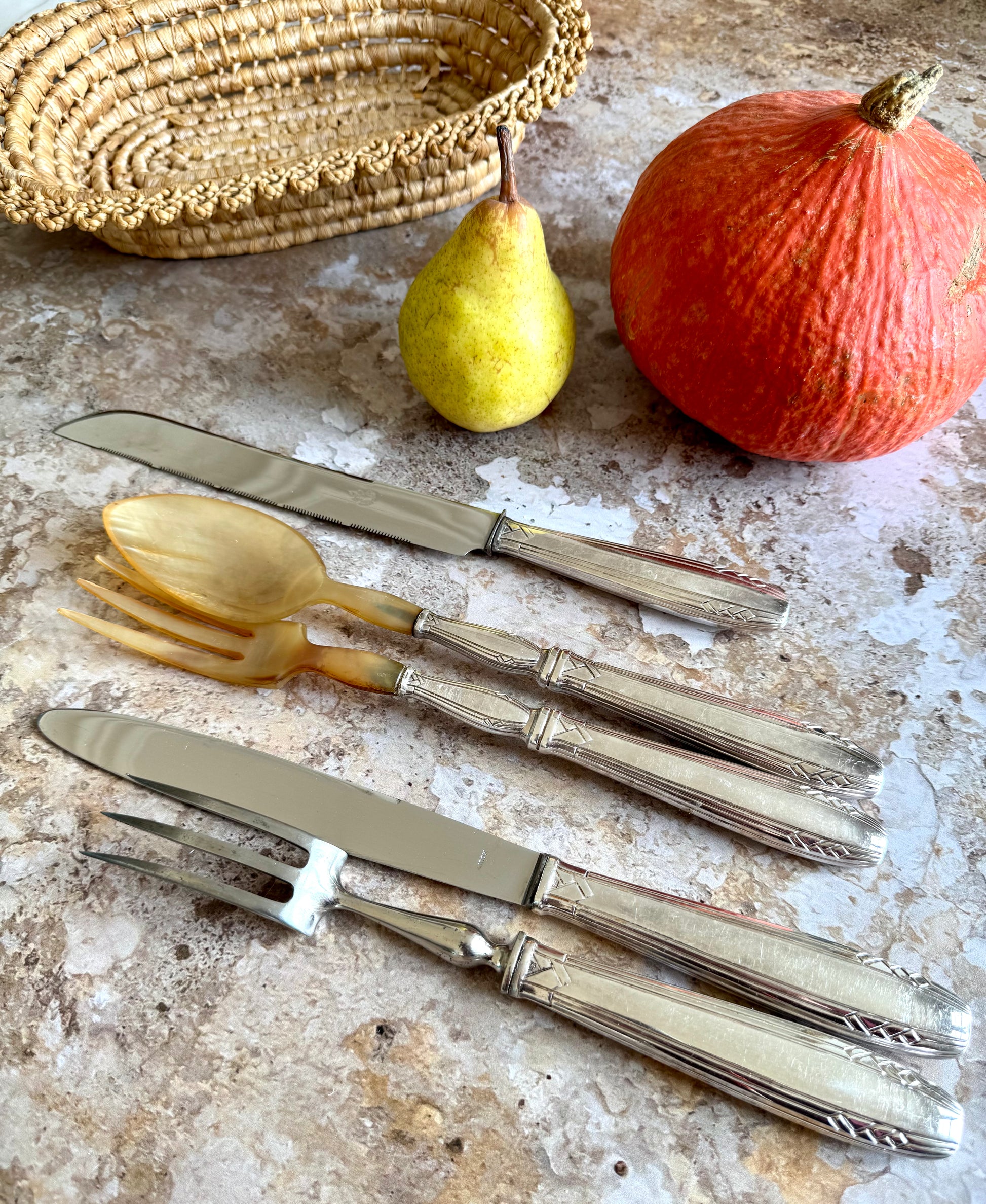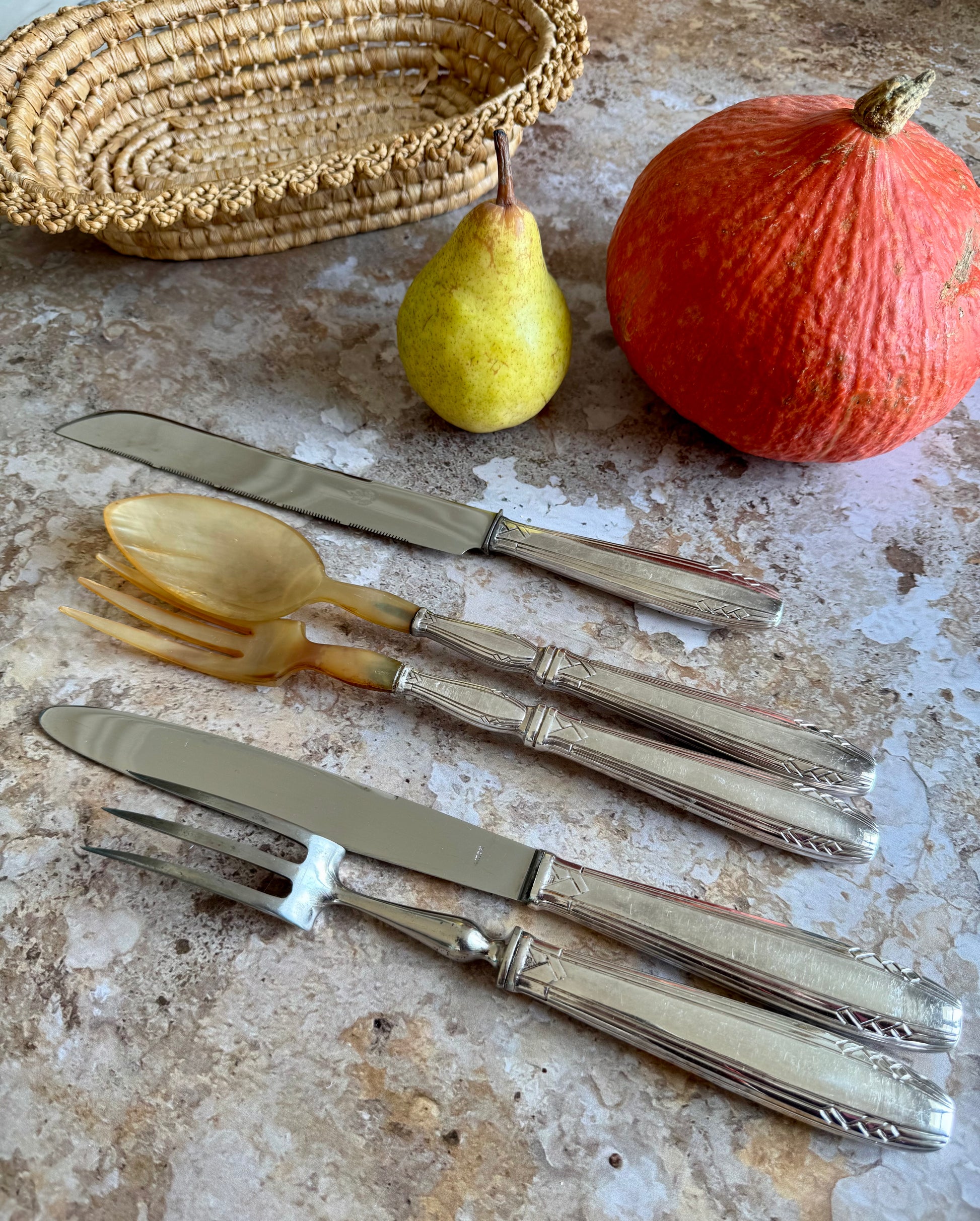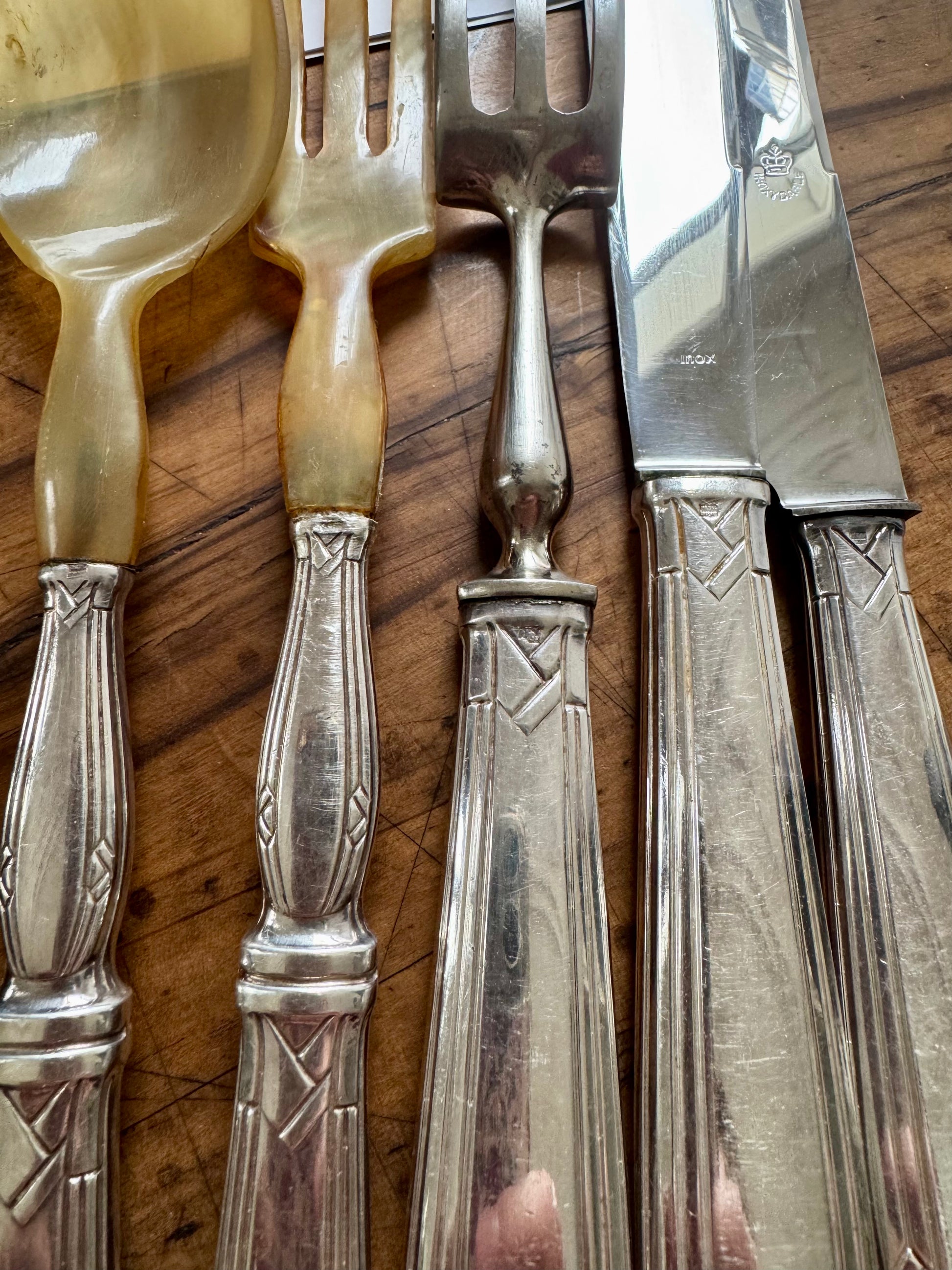 - Ensemble comprenant une paire de couverts à salade en argent fourré et en corne, une paire de couverts à découper la viande (manches en métal argenté et lame du couteau en inox) et d'un couteau à découper le pain (manche en métal argenté et lame inox). Présence de poinçons.