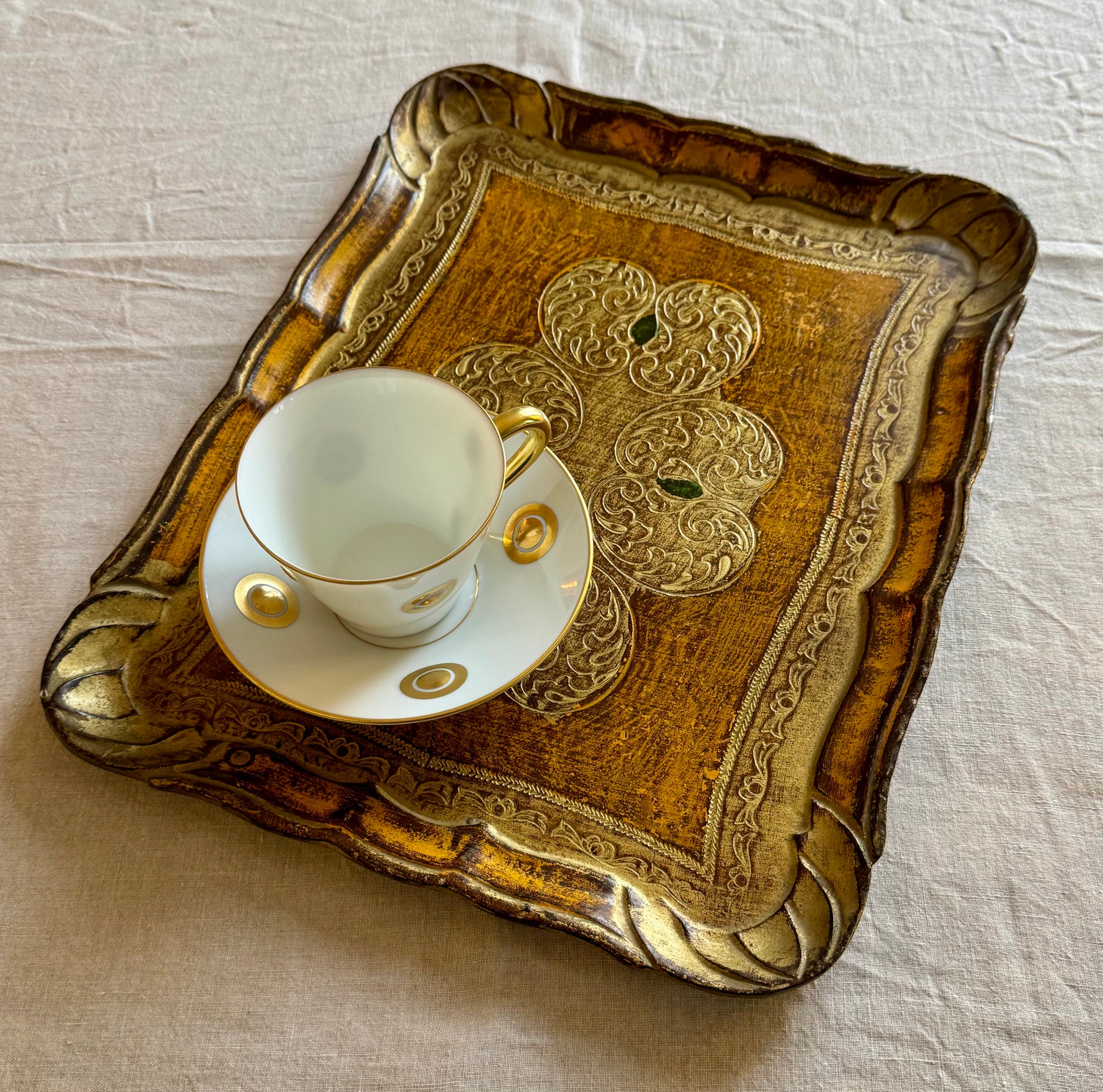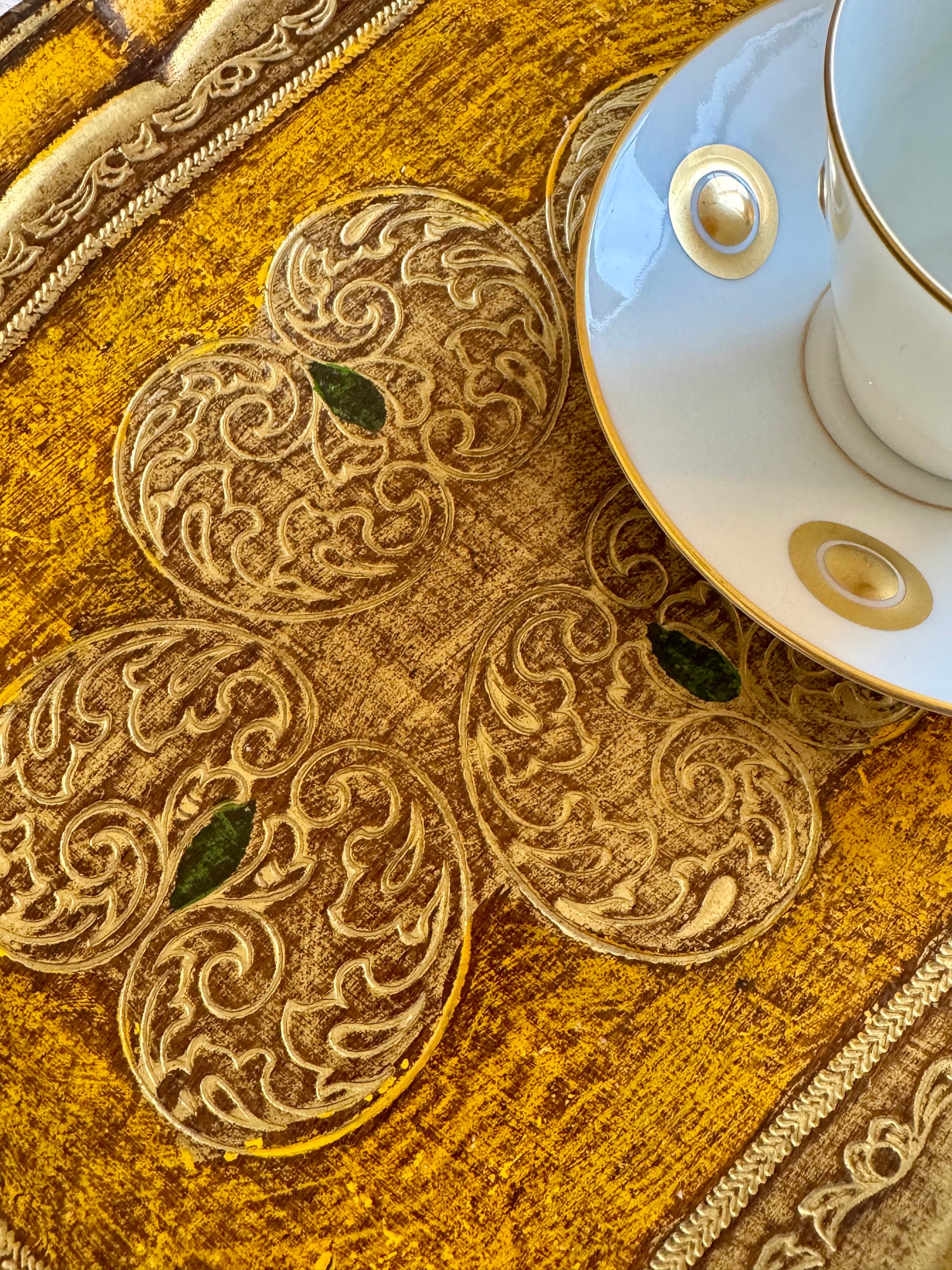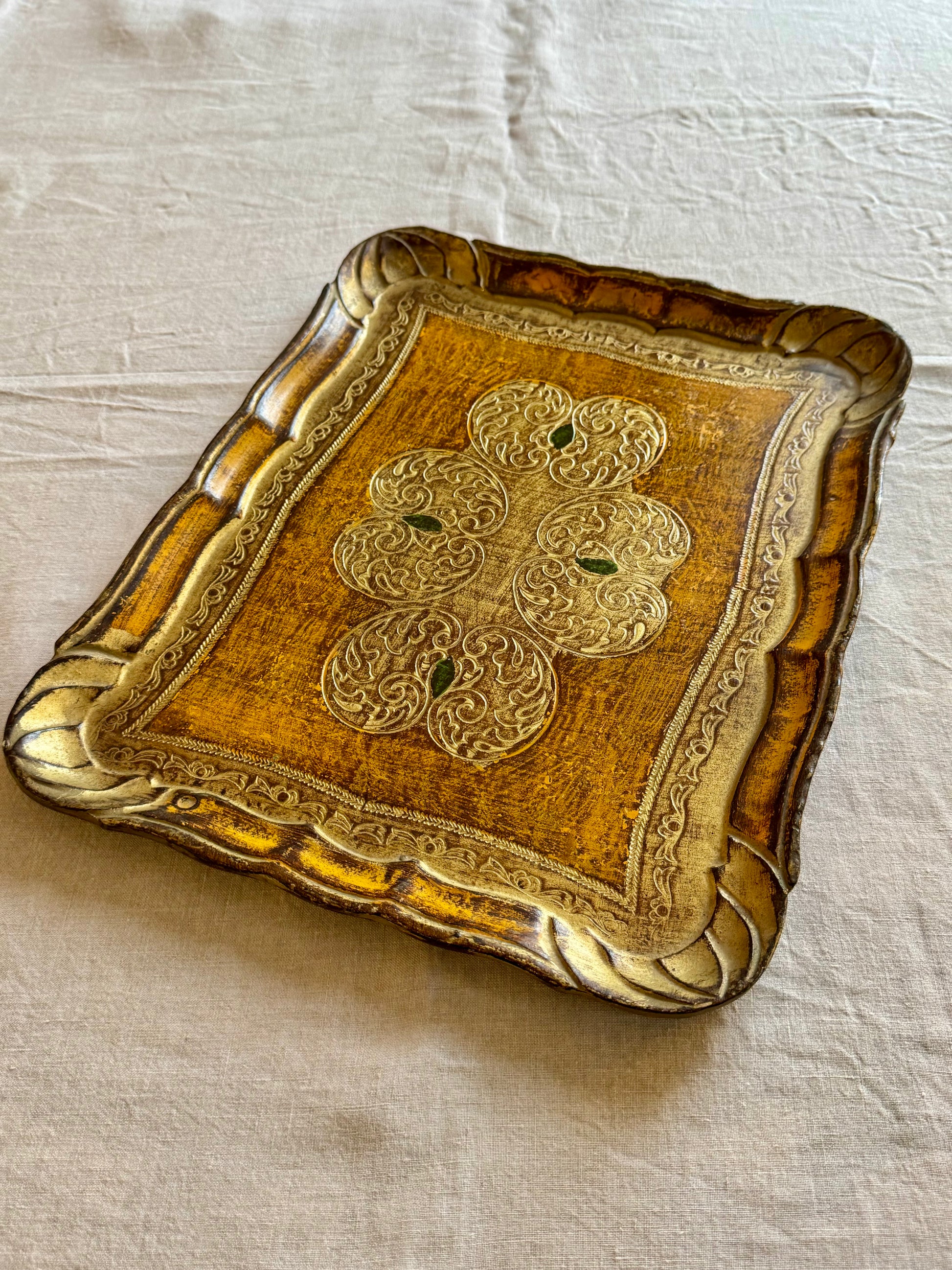 Ce petit plateau florentin est en bois sculpté et peint à la main. Utilisé pour le service ou comme décoration sur une table basse ou une console, il vous apportera une touche chaleureuse et rococo.