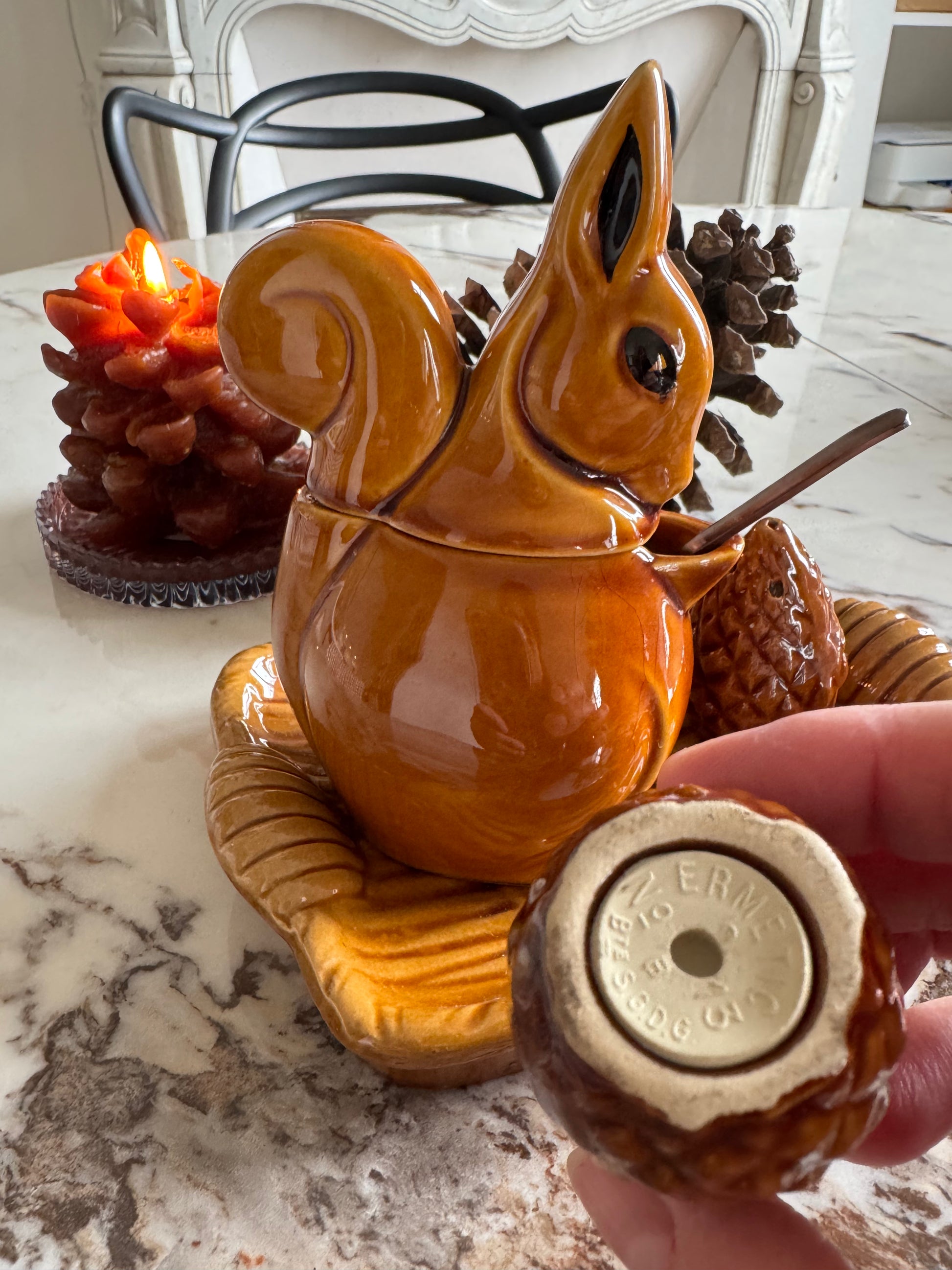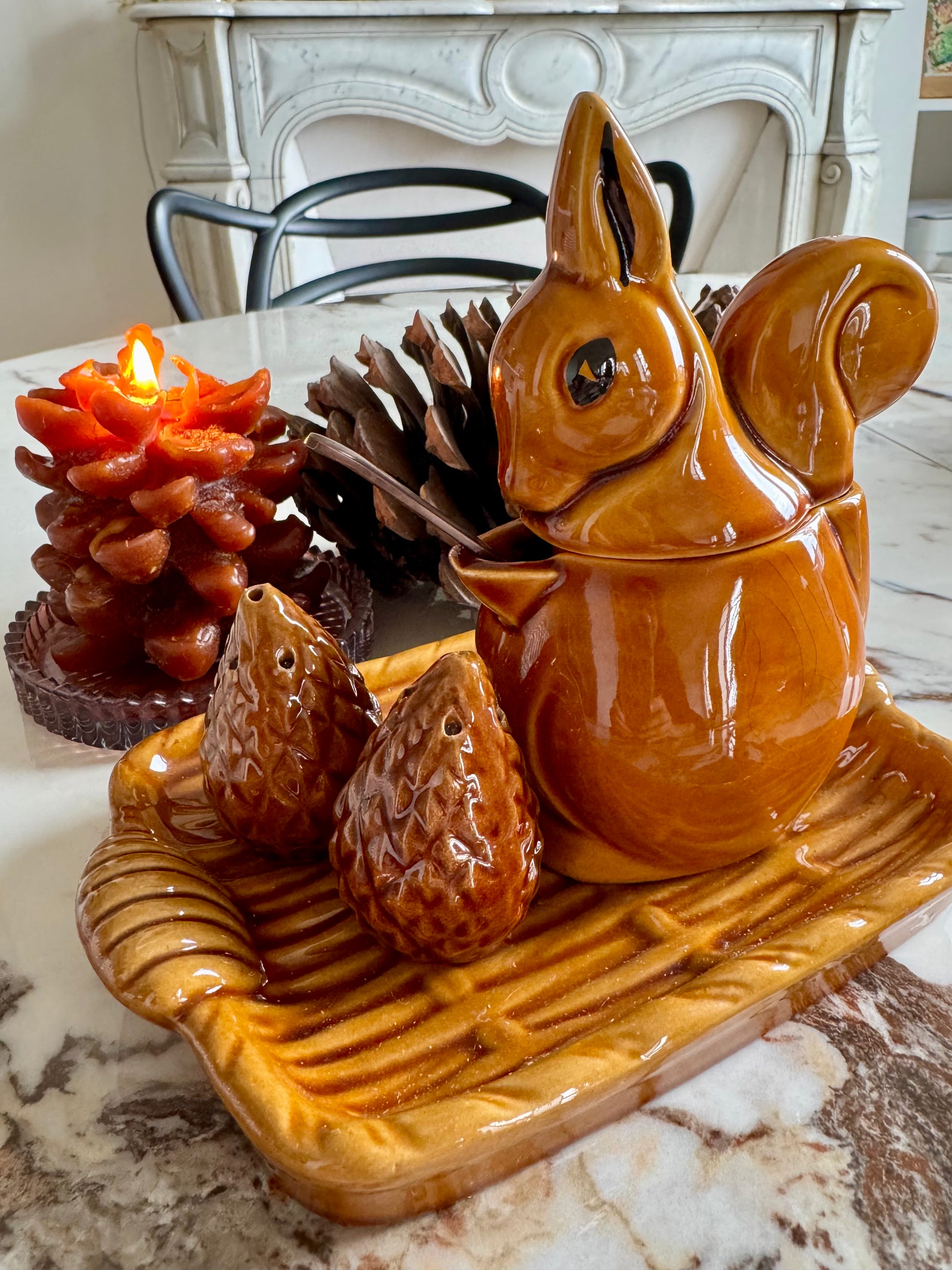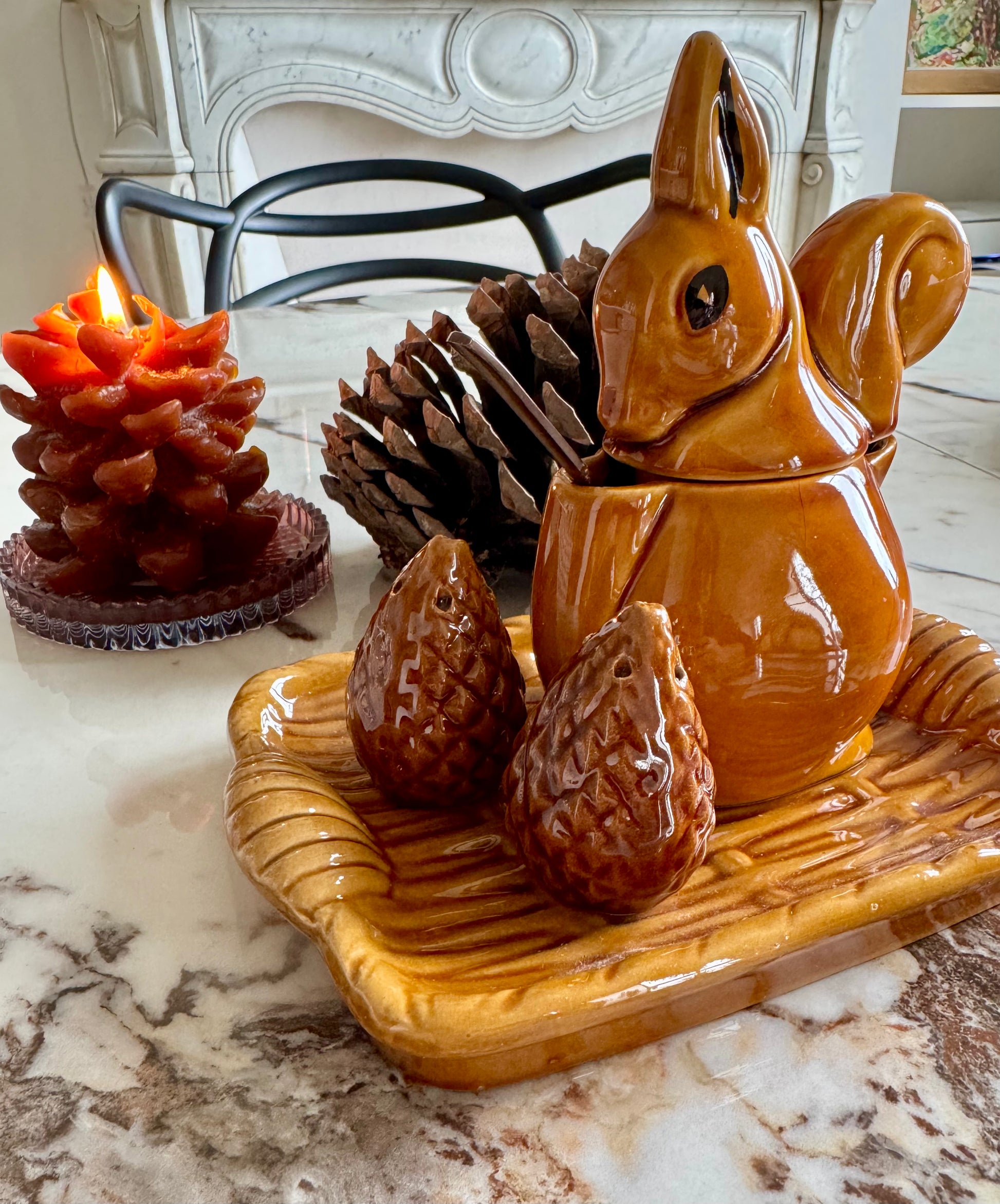 - Service composé d'un moutardier en forme d'écureuil, de deux pommes de pin salière et poivrier et d'un petit plateau de présentation. Céramique marron/caramel de la manufacture de St Clément.