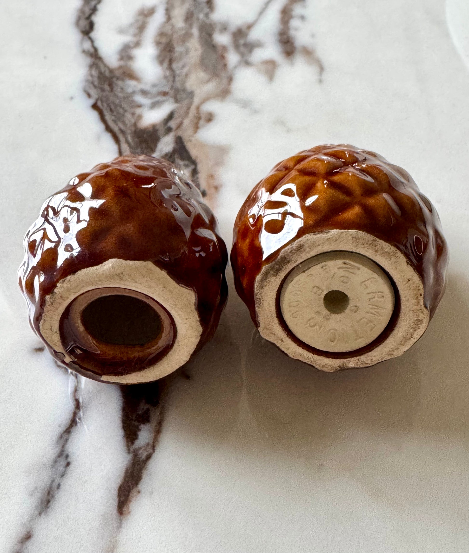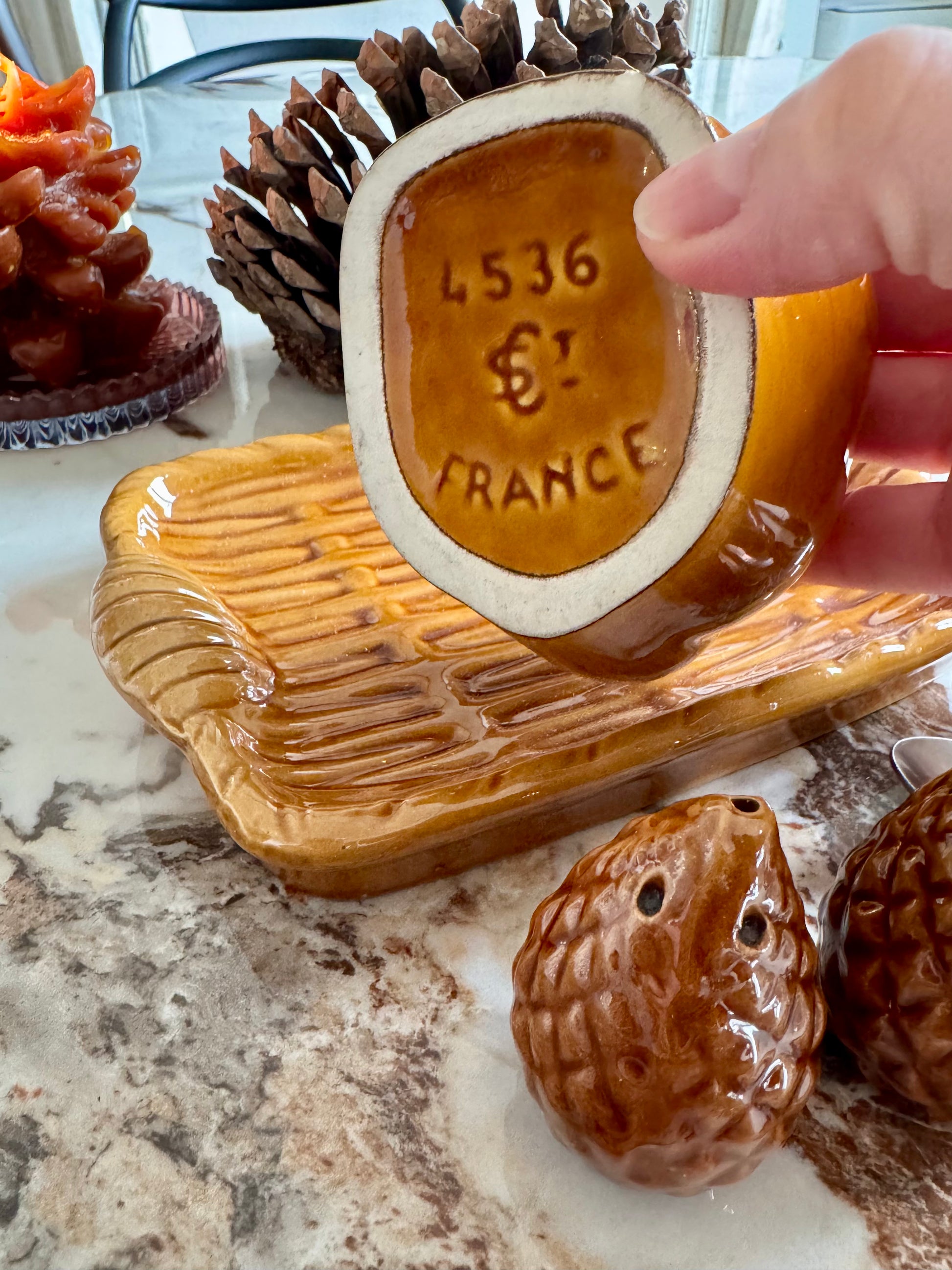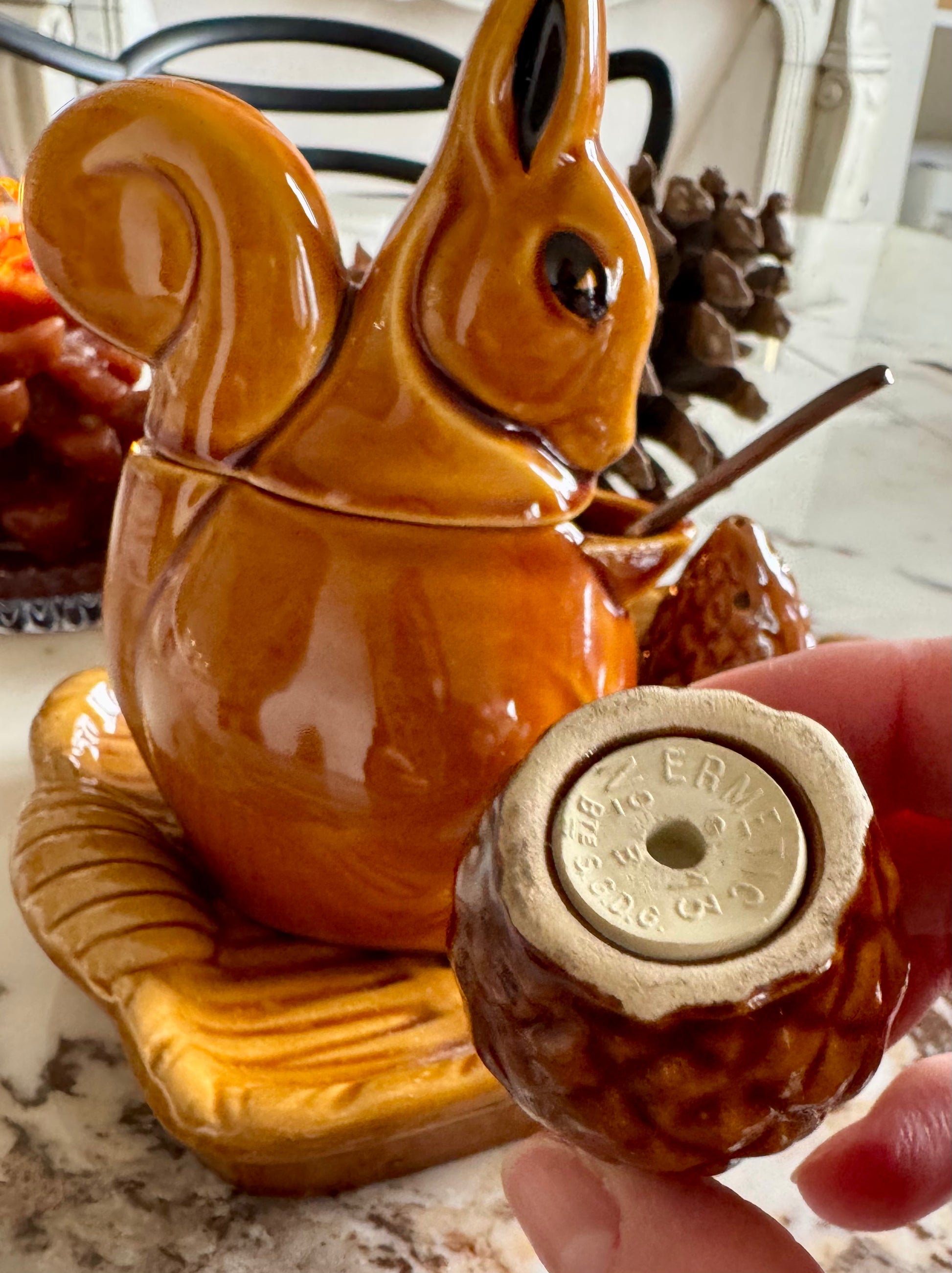 - Service composé d'un moutardier en forme d'écureuil, de deux pommes de pin salière et poivrier et d'un petit plateau de présentation. Céramique marron/caramel de la manufacture de St Clément.